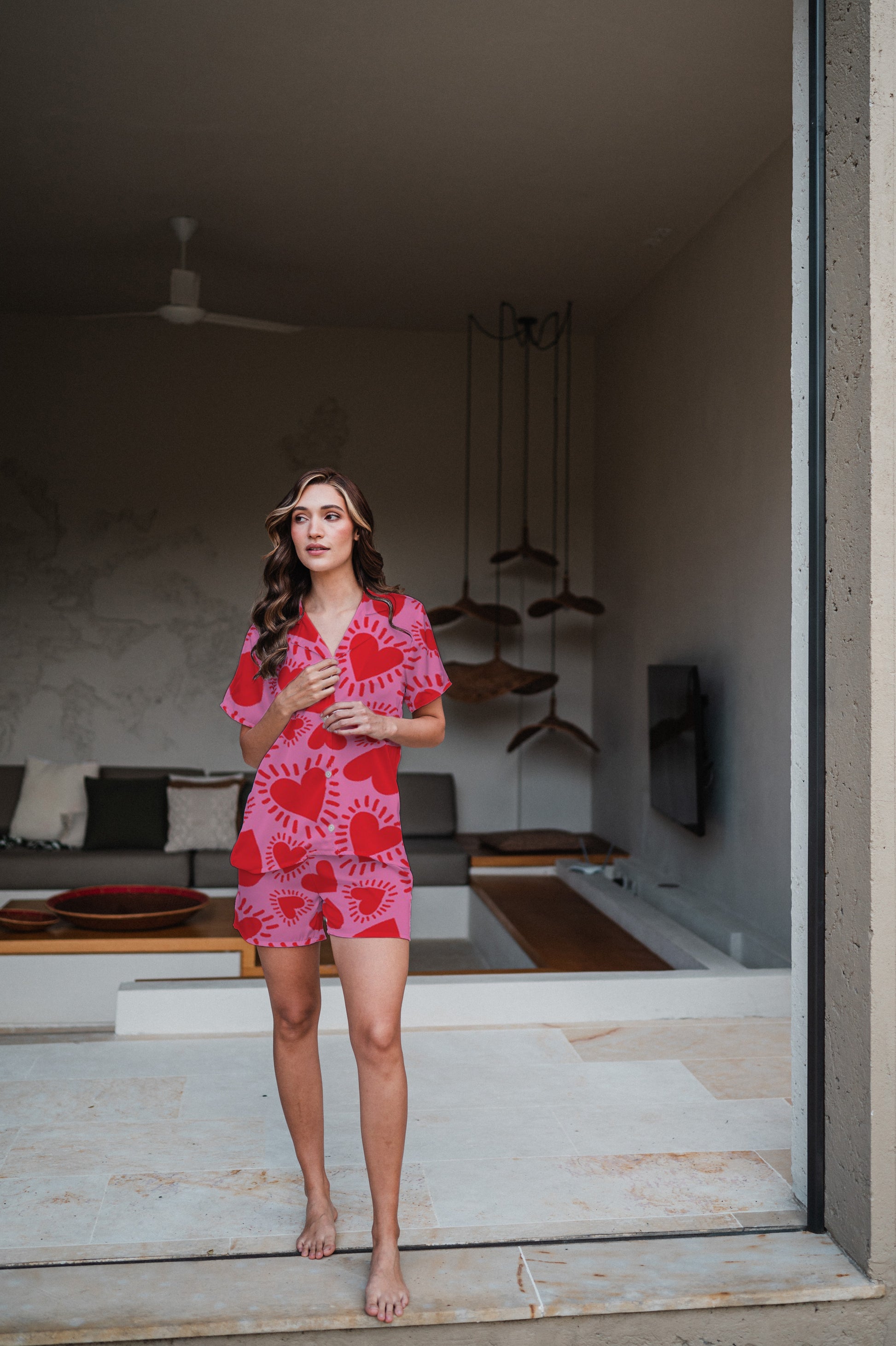 Vibrante, femenina y llena de energía, esta pijama de camisa manga corta y short en el print Amor Fucsia es una declaración de amor propio con estilo. Su estampado está compuesto por corazones y mensajes positivos en tonos intensos sobre una base fucsia que irradia fuerza, alegría y autenticidad.
