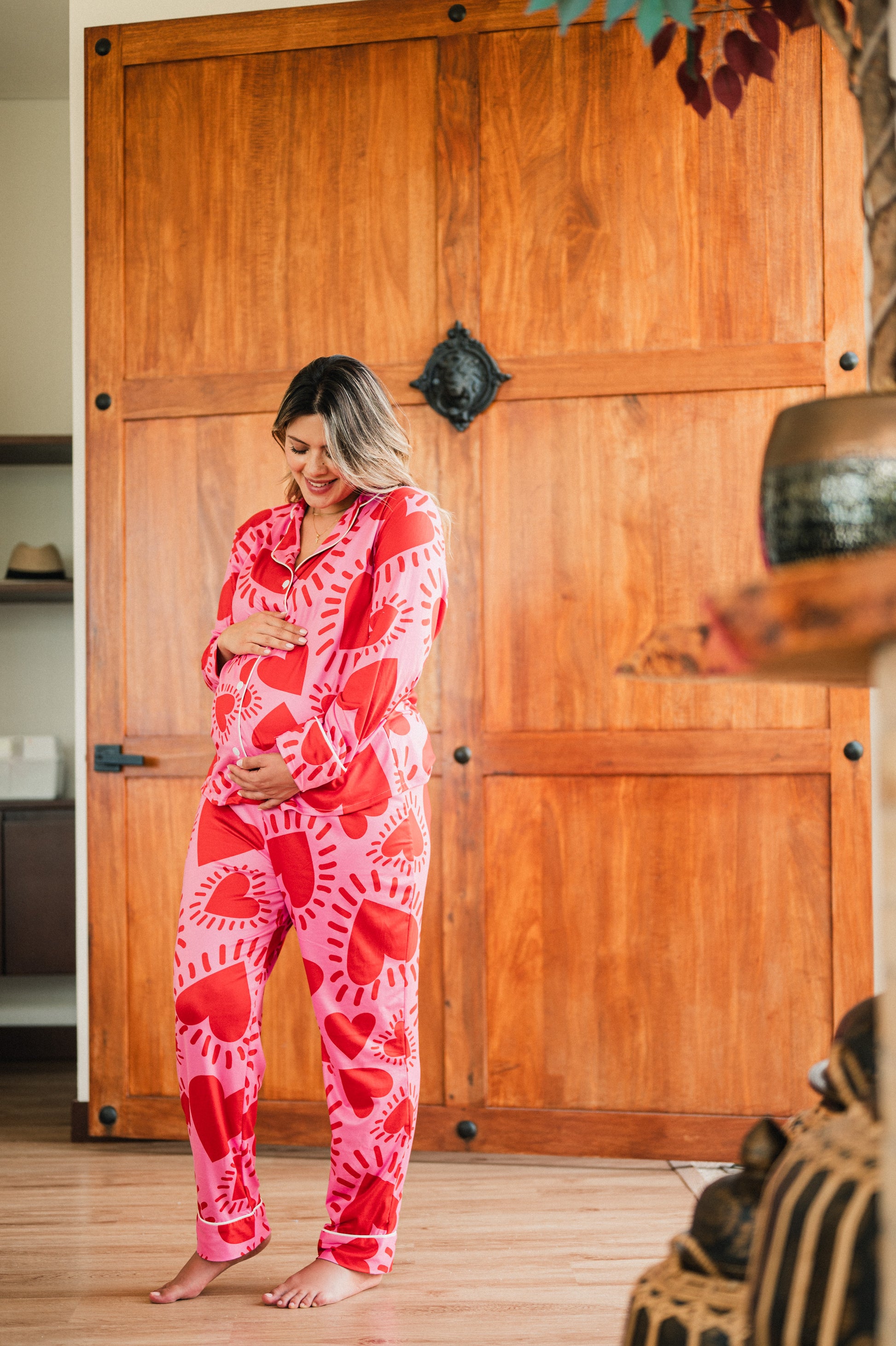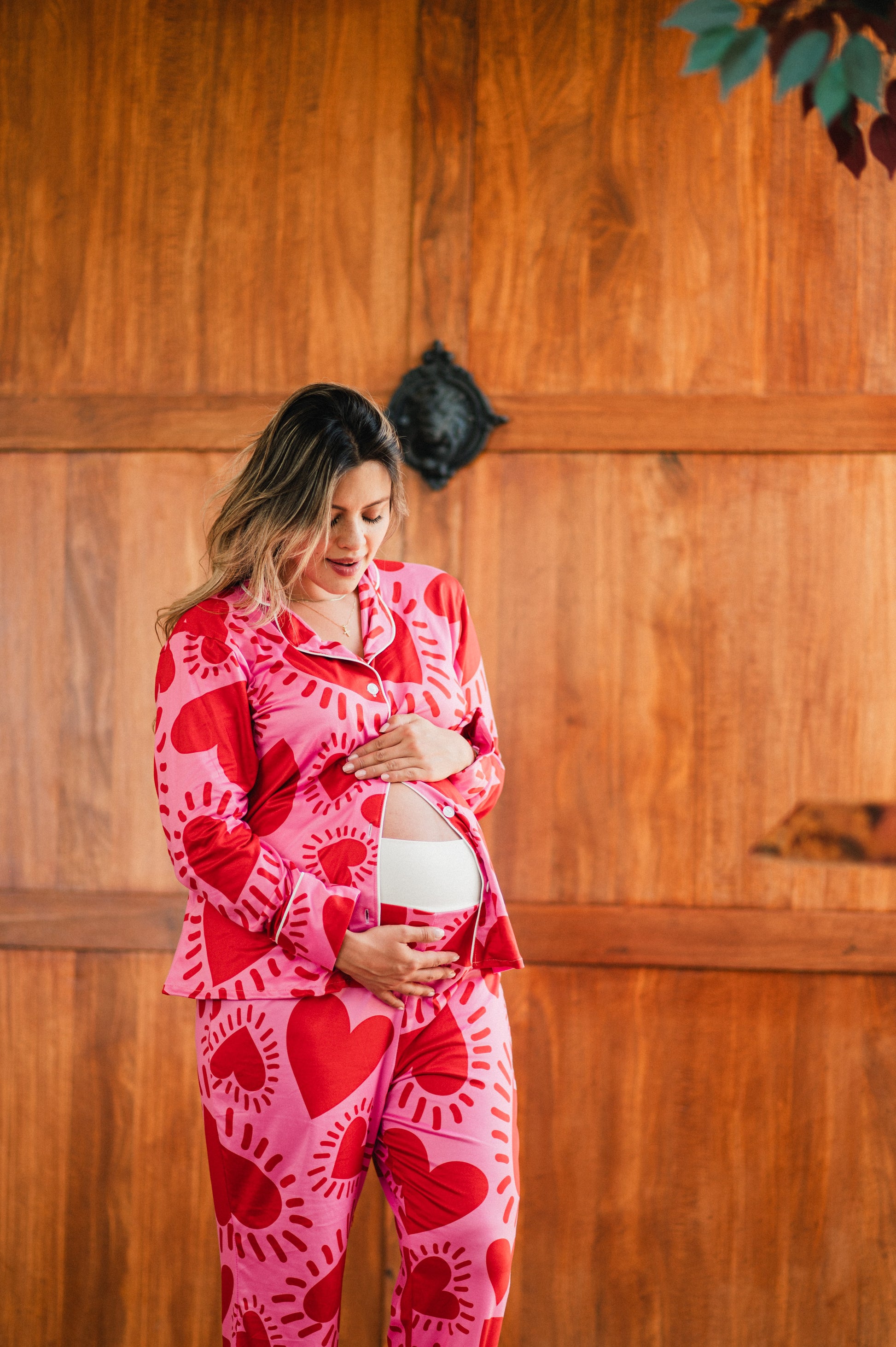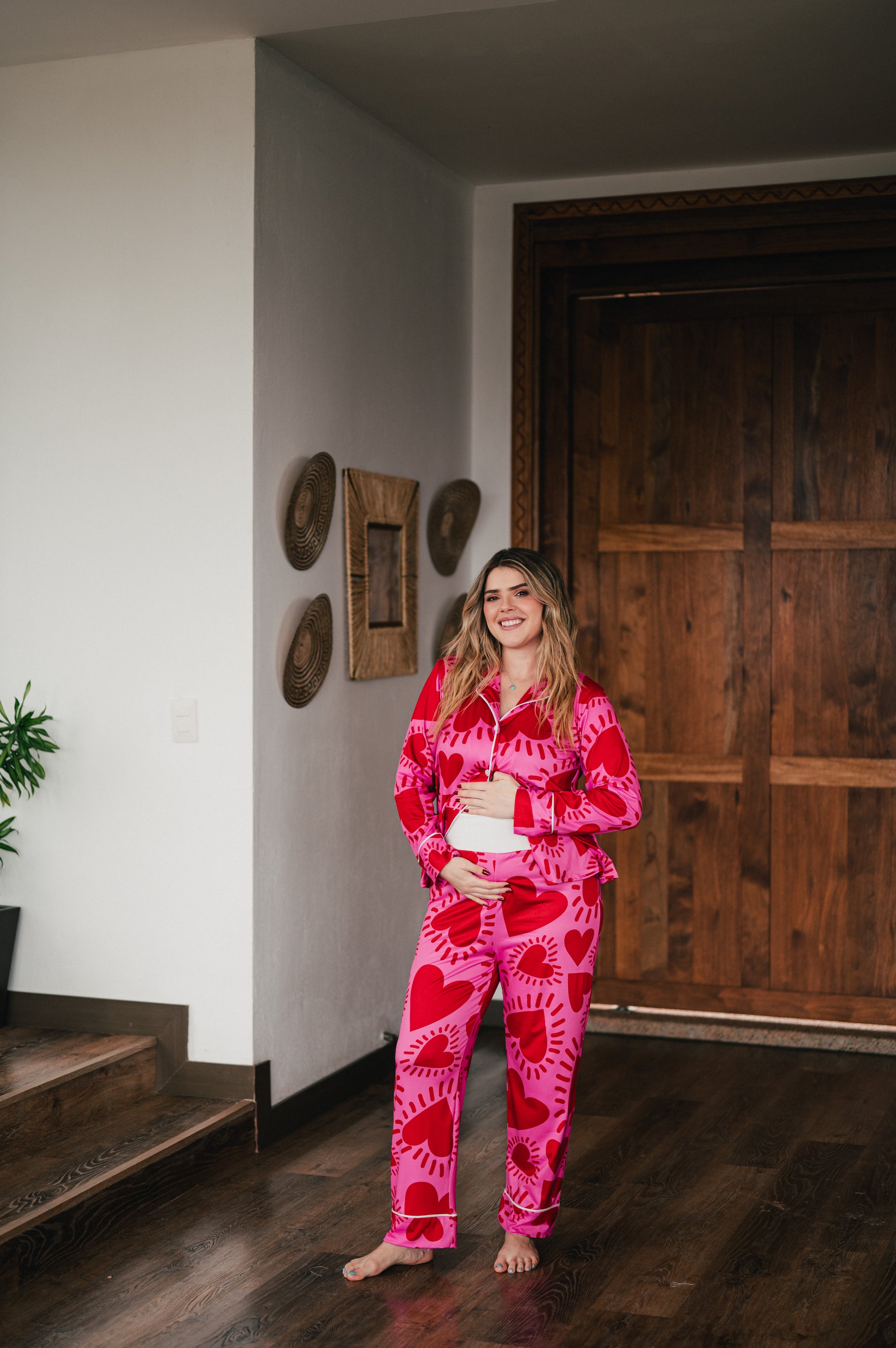 Vibrante, femenina y llena de energía, nuestra pijama de maternidad camisa y pantalón en el print Amor Fucsia está hecha para acompañarte con fuerza y estilo en cada momento de tu embarazo. Su estampado de corazones intensos sobre fondo fucsia celebra el amor propio, la conexión con tu bebé y la alegría de vivir esta etapa única.