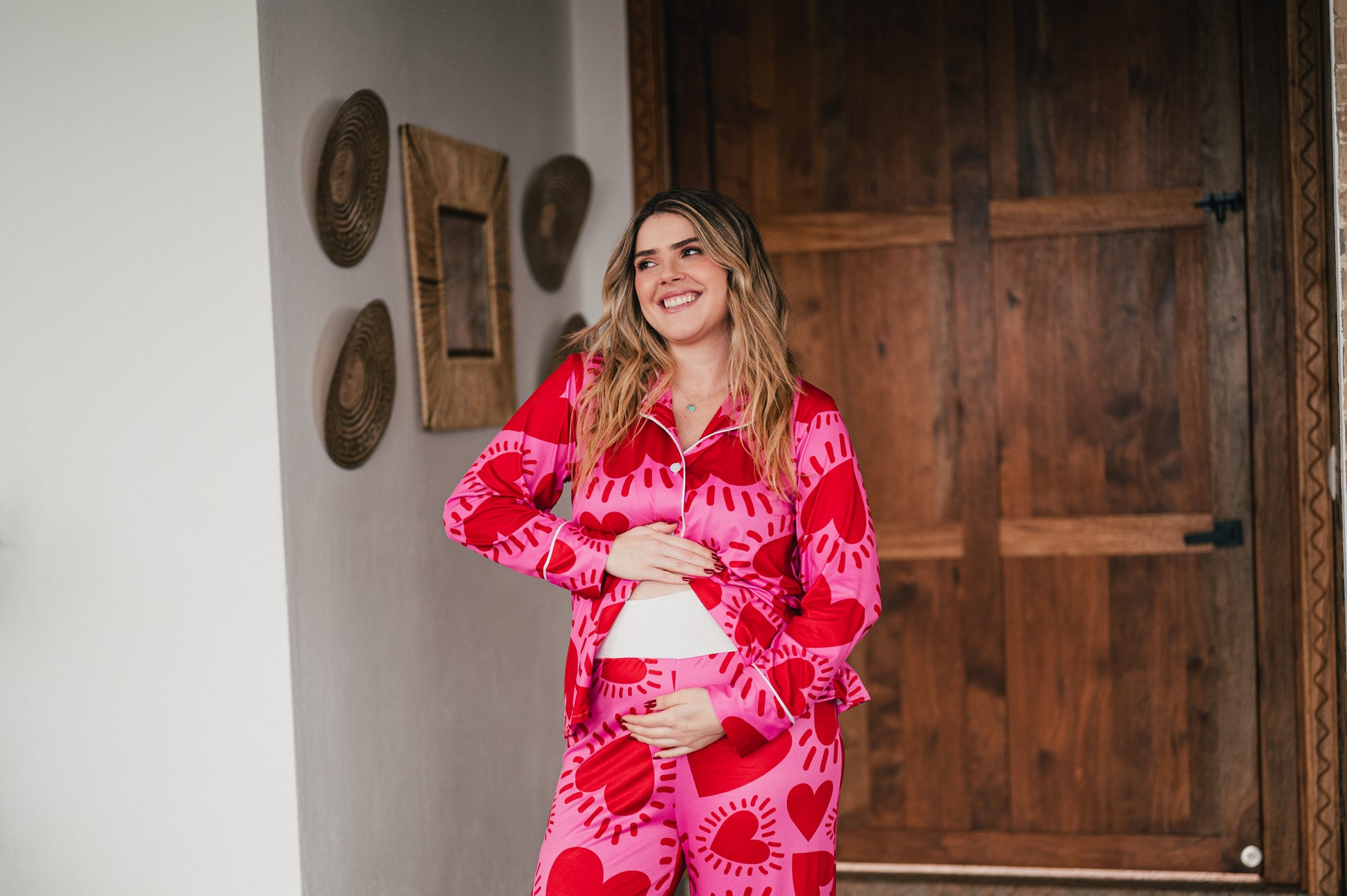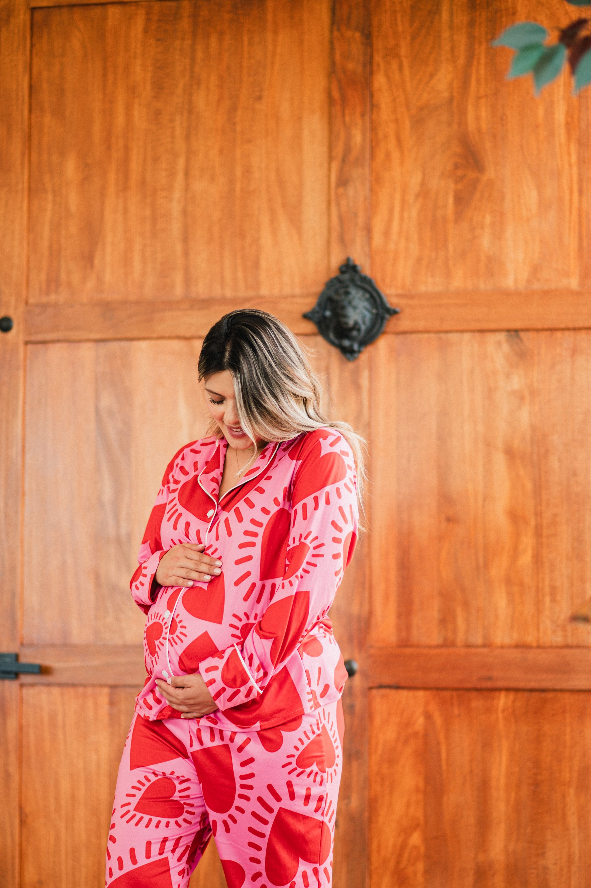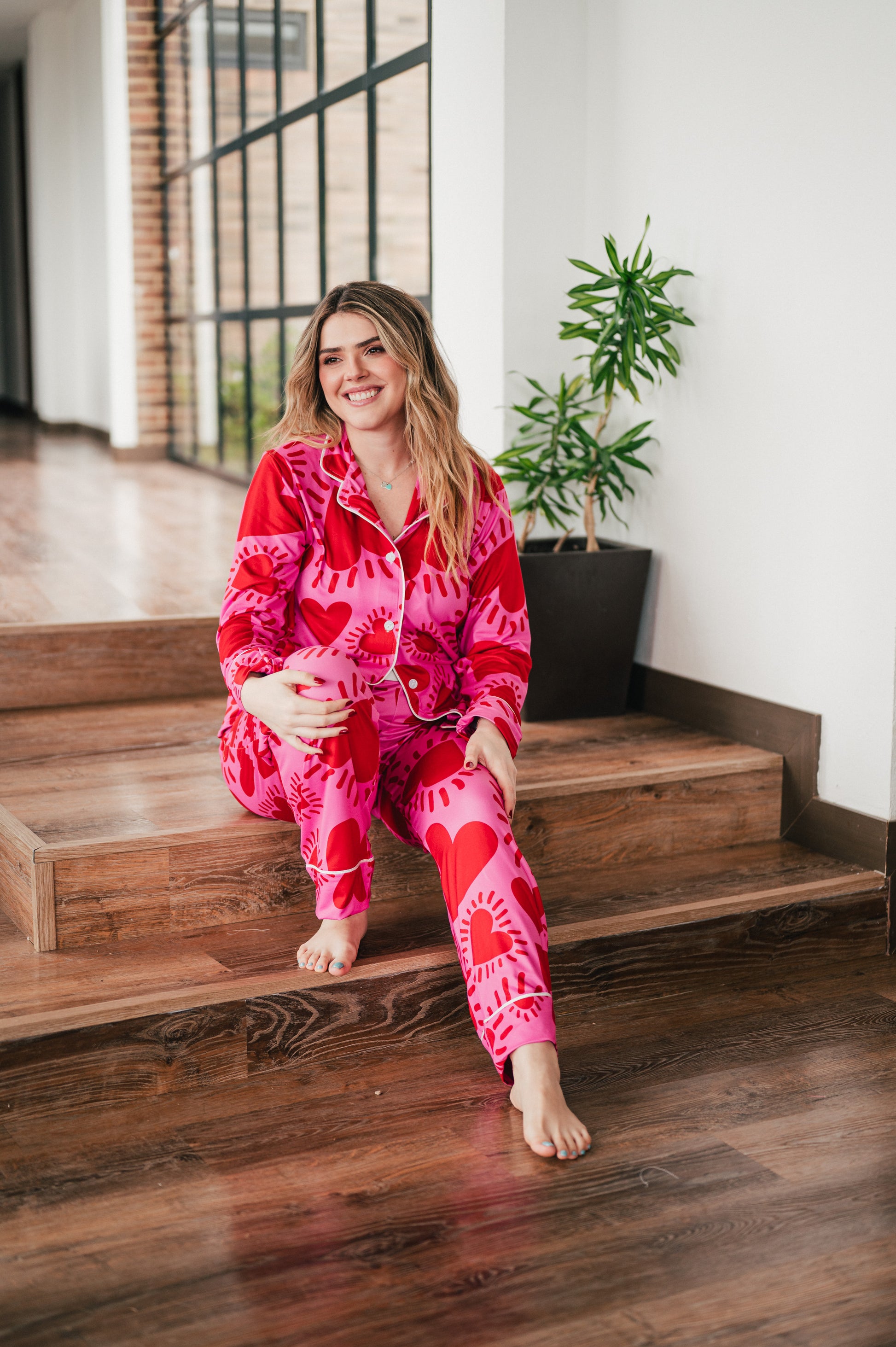 Vibrante, femenina y llena de energía, nuestra pijama de maternidad camisa y pantalón en el print Amor Fucsia está hecha para acompañarte con fuerza y estilo en cada momento de tu embarazo. Su estampado de corazones intensos sobre fondo fucsia celebra el amor propio, la conexión con tu bebé y la alegría de vivir esta etapa única.
