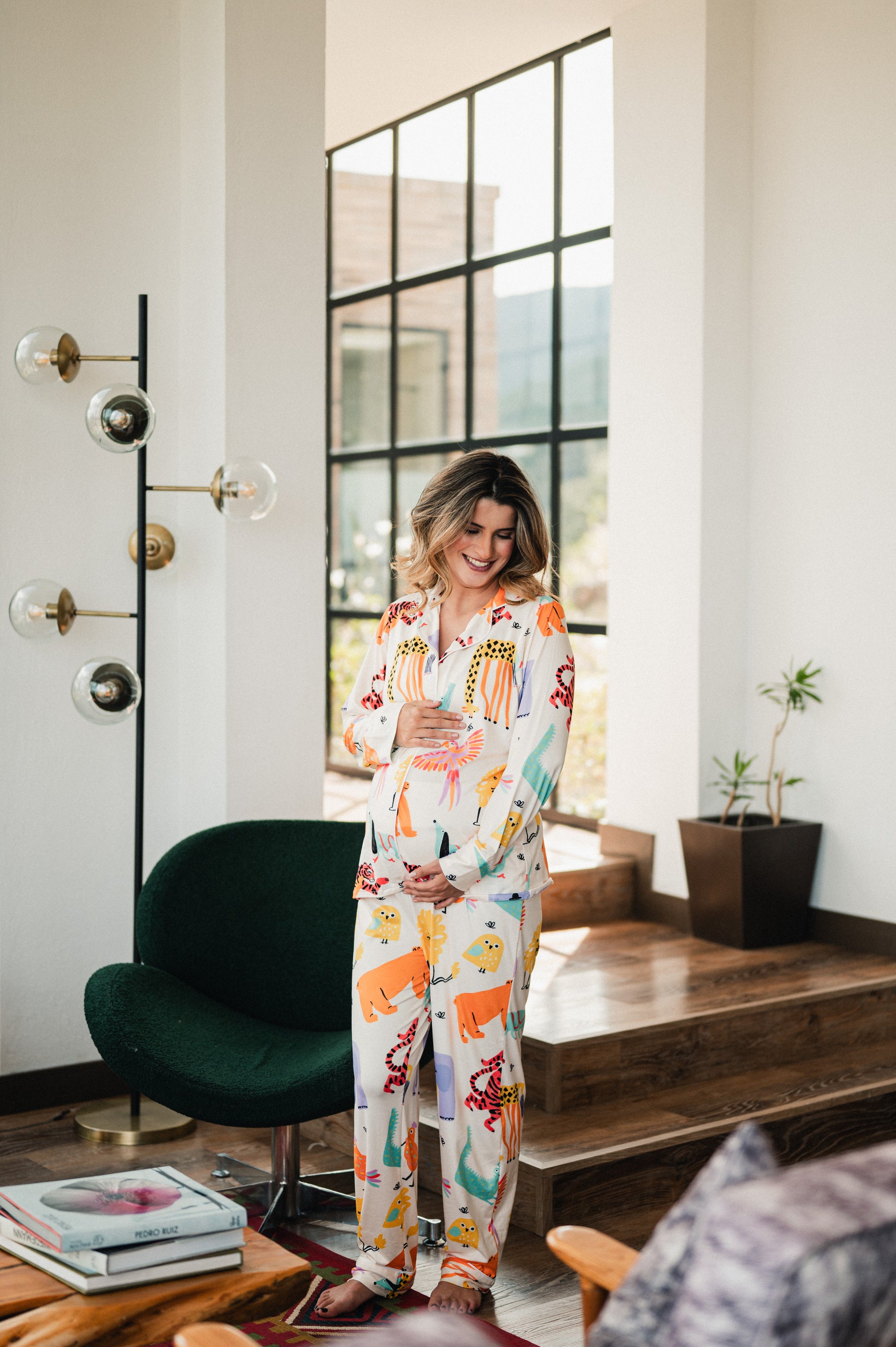 Llena de vida, alegría y espíritu aventurero, nuestra pijama de maternidad camisa y pantalón en el print Animales de la Selva está diseñada para acompañarte durante el embarazo y la lactancia con estilo y total comodidad. Su estampado colorido con elefantes, leones y jirafas sobre un fondo suave te conecta con la fuerza natural de esta etapa tan especial.