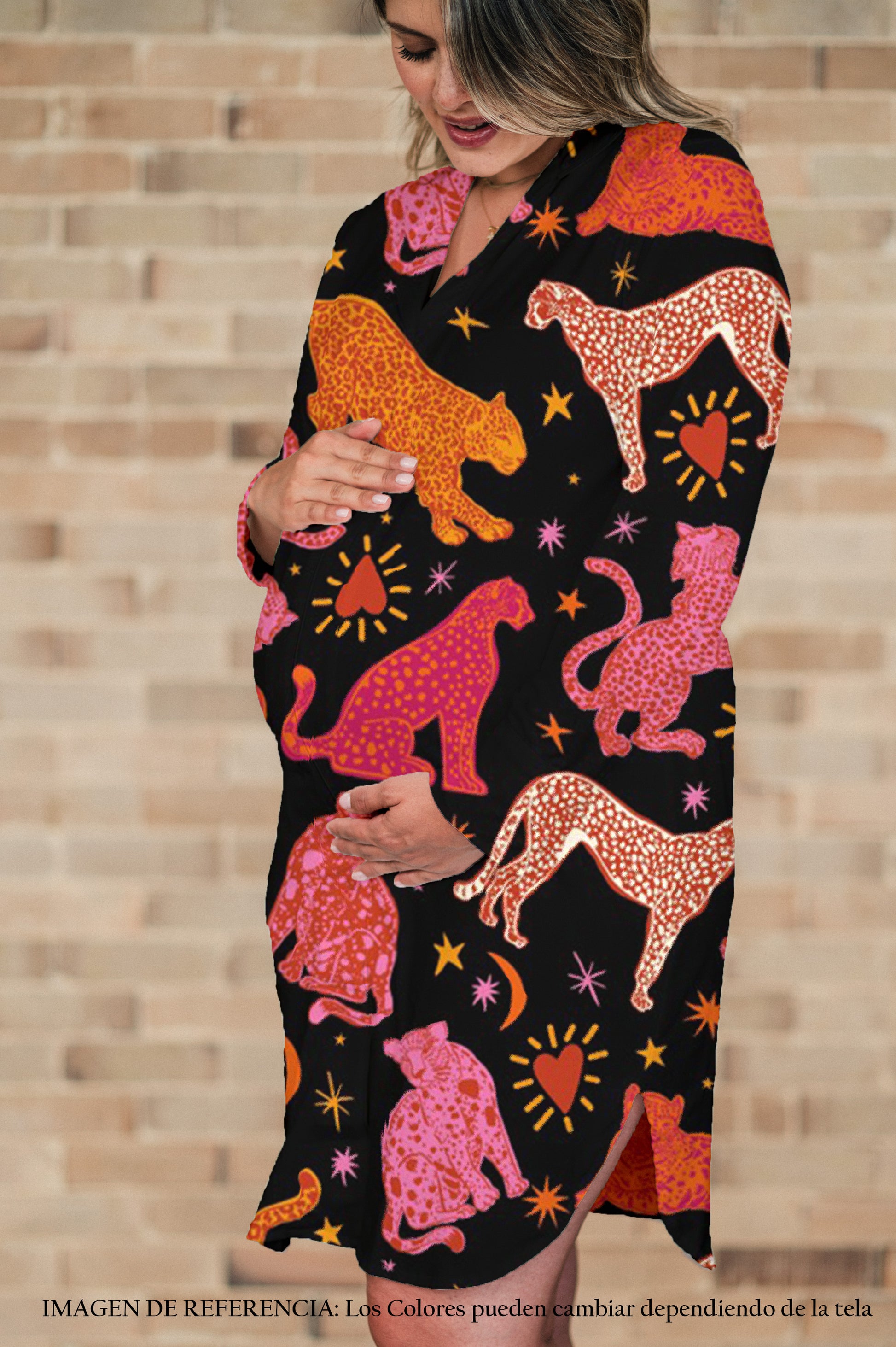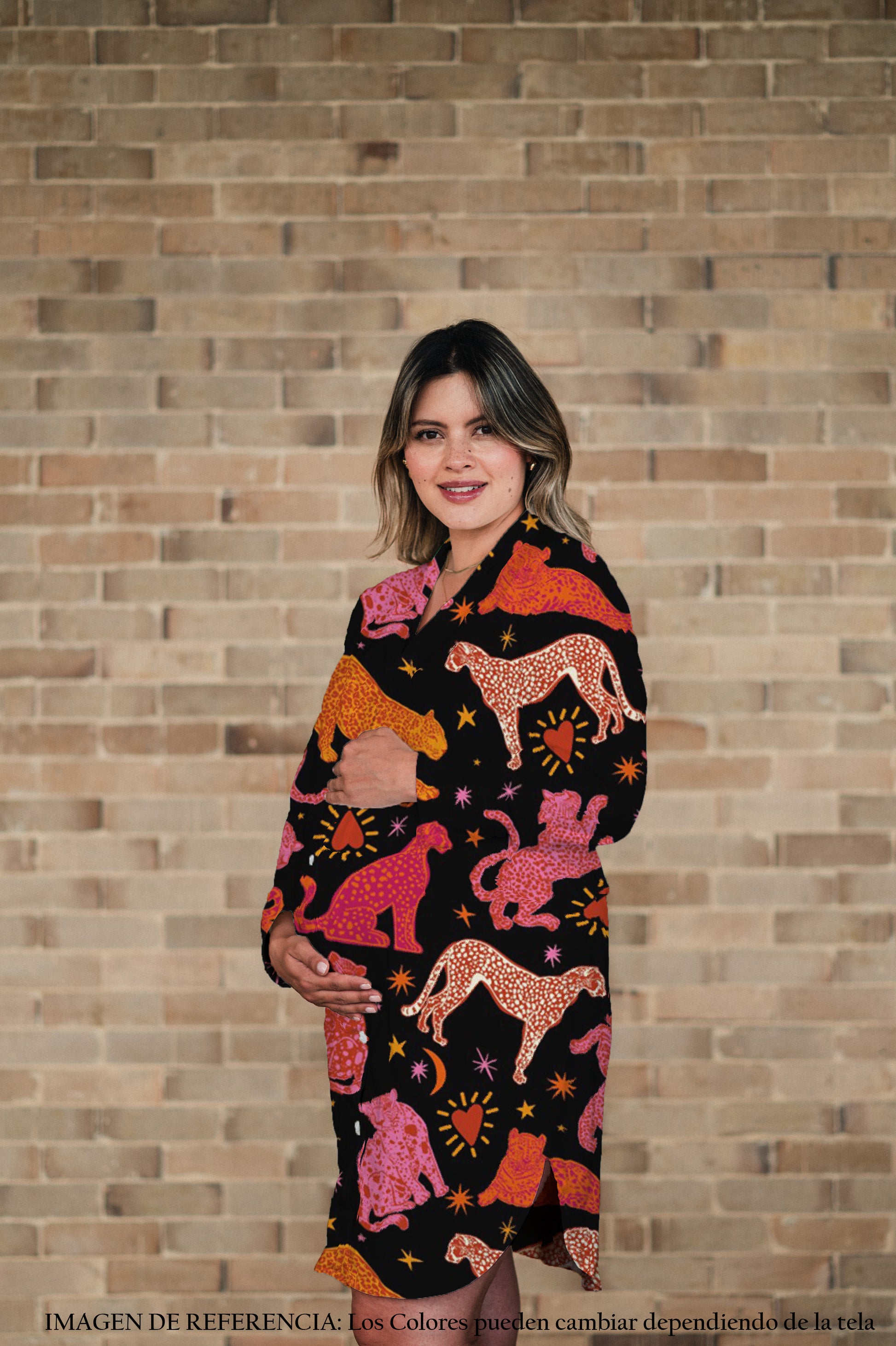 Siente la fuerza y el misterio de la naturaleza con nuestro camisón Fantasia Felina Negro. Su estampado audaz de felinos en tonos negros combina elegancia y personalidad para la mamá moderna. Diseñado con manga larga para un abrigo delicado, este camisón te ofrece máxima comodidad y estilo durante toda la maternidad. Perfecto para quienes desean expresar su lado salvaje con suavidad y glamour.