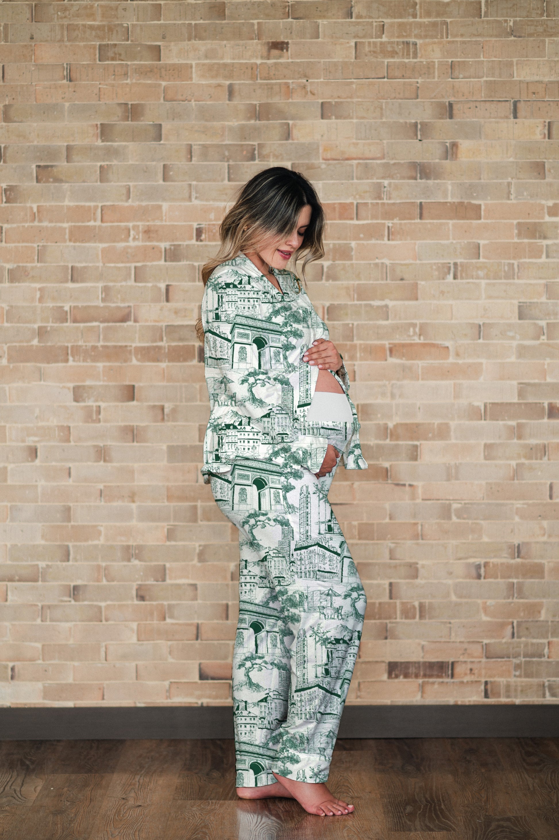 Su estampado en tonos verdes inspirado en paisajes urbanos transmite equilibrio y serenidad, creando un ambiente perfecto para tu descanso. Una pijama femenina y cómoda que se adapta a tu cuerpo y a tus necesidades durante el embarazo y la lactancia.