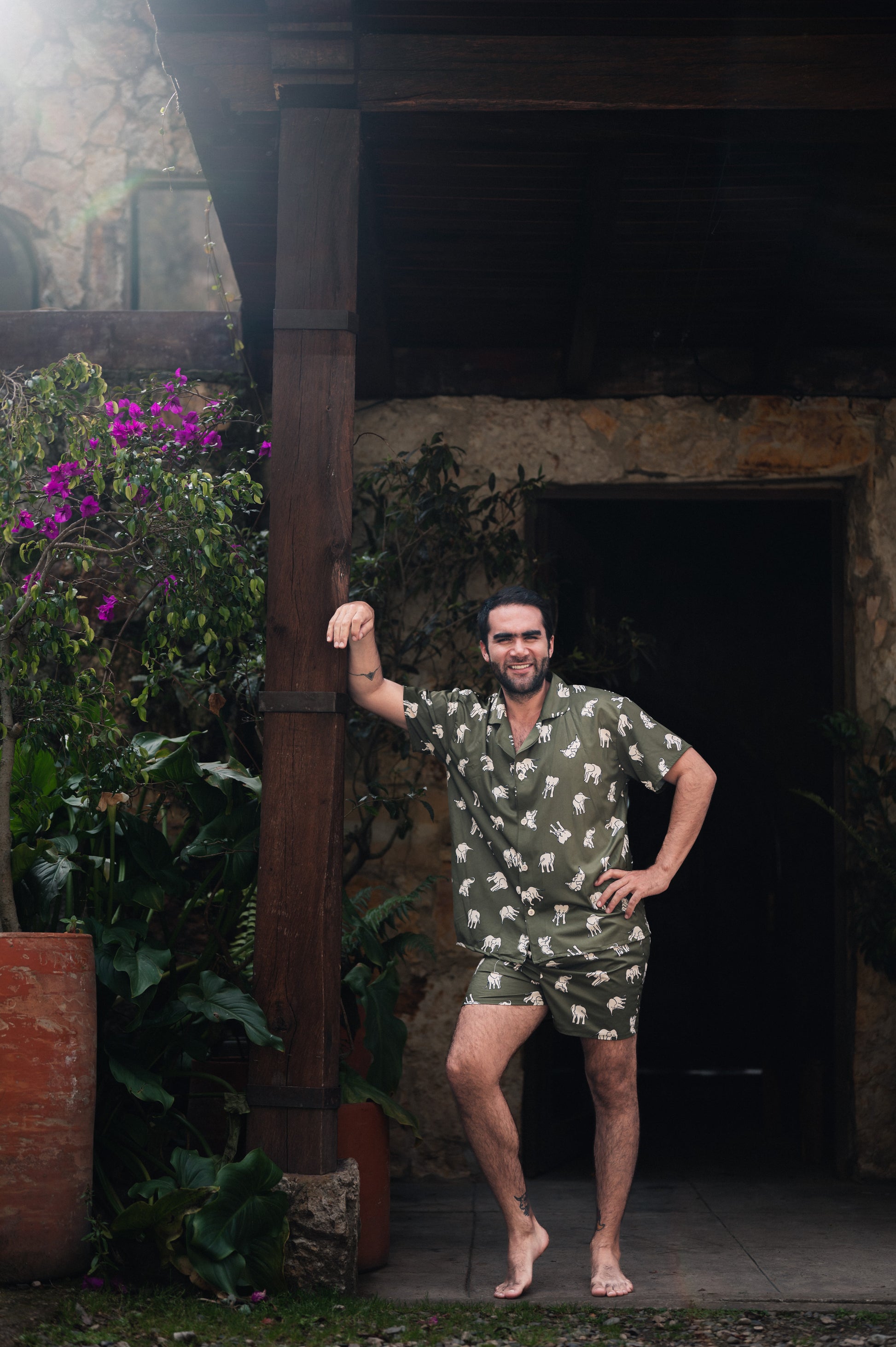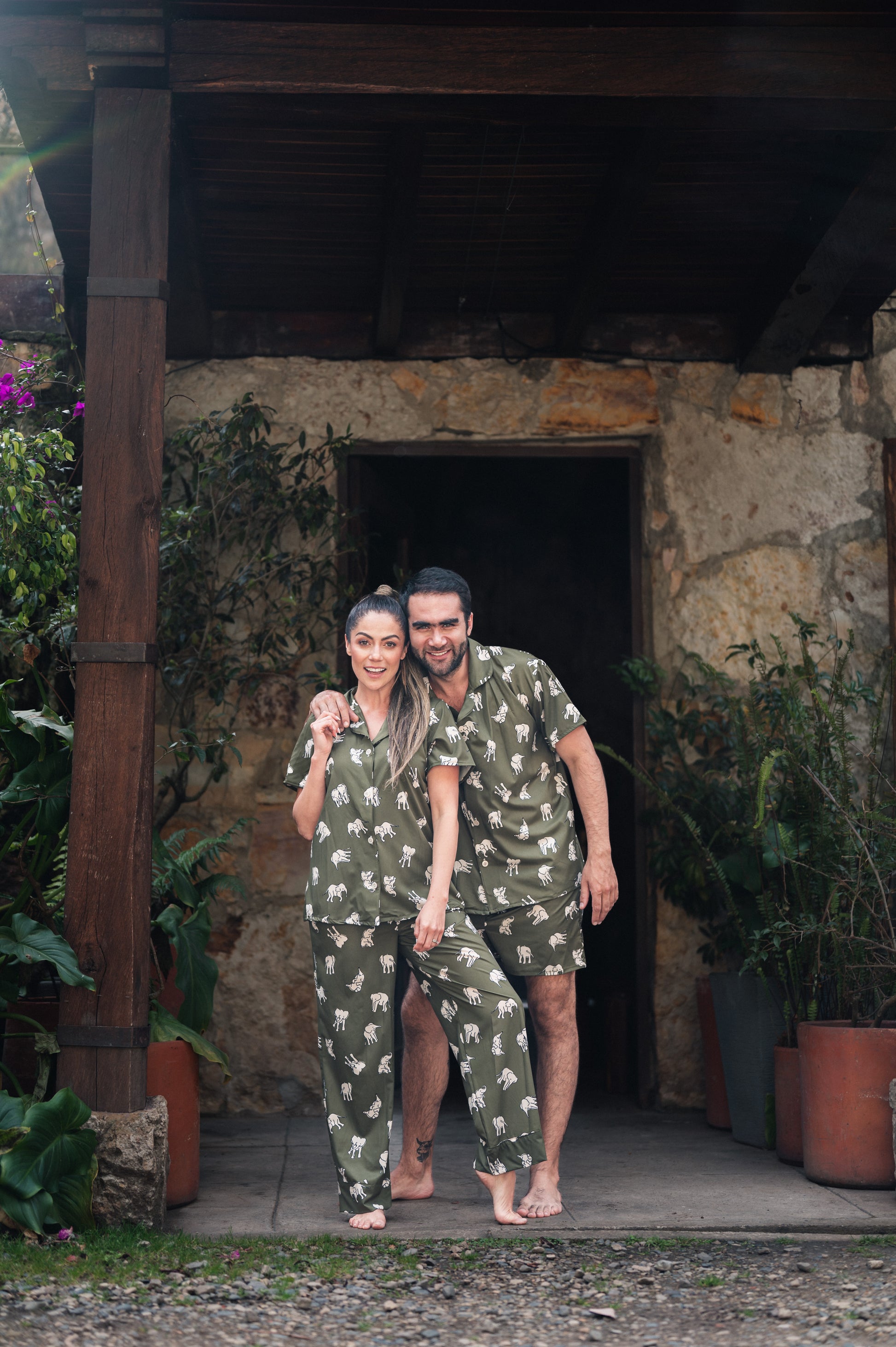 El fondo verde oliva da vida a una estampación de elefantitos blancos en diferentes posturas, creando un patrón lúdico y sofisticado que te hará destacar incluso en tus momentos de descanso. La camisa de silueta relajada y el short de tiro medio te brindan libertad de movimiento y frescura durante toda la noche. Perfecta para dormir, descansar o disfrutar de un fin de semana tranquilo en casa con mucho estilo.