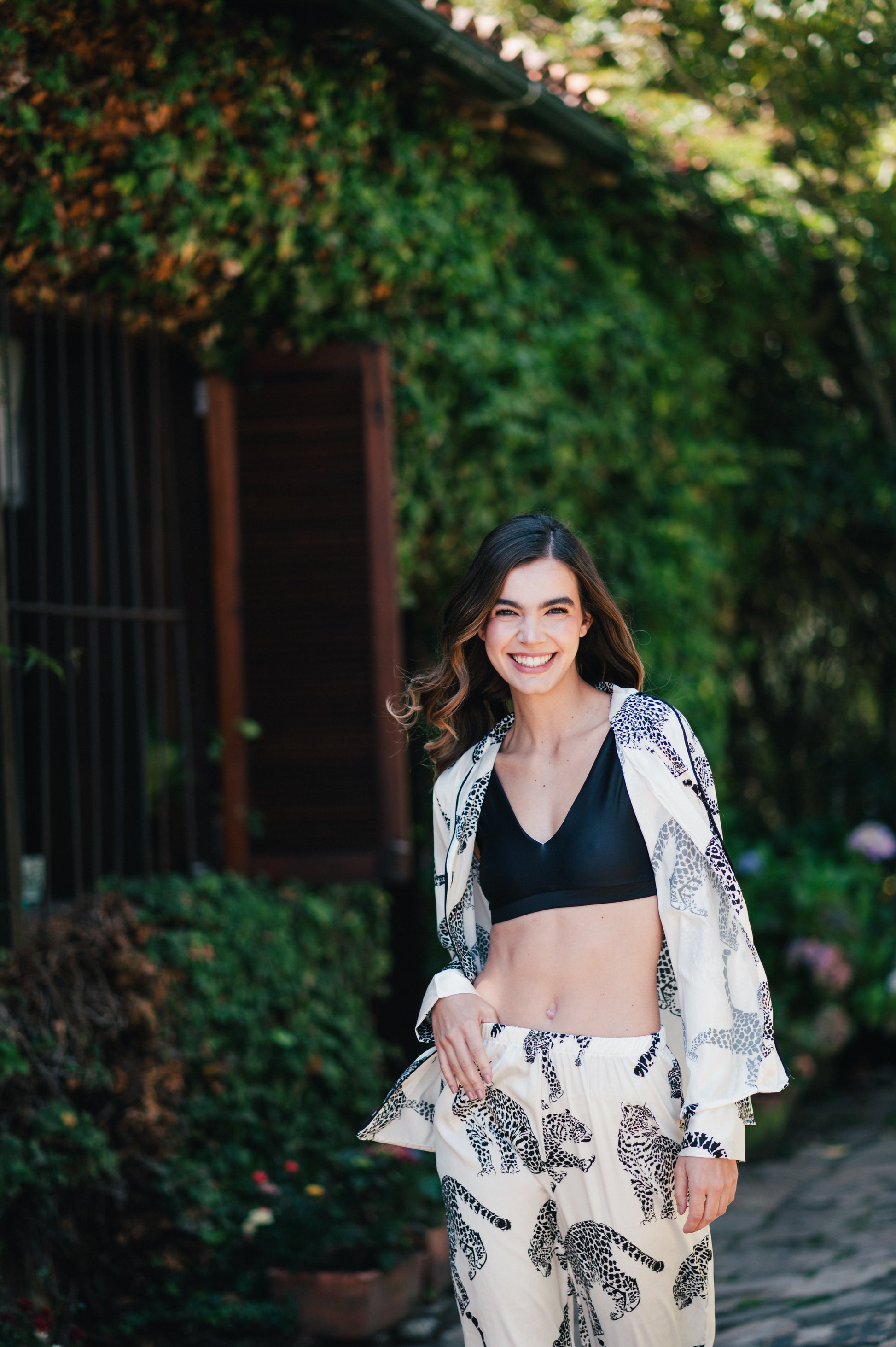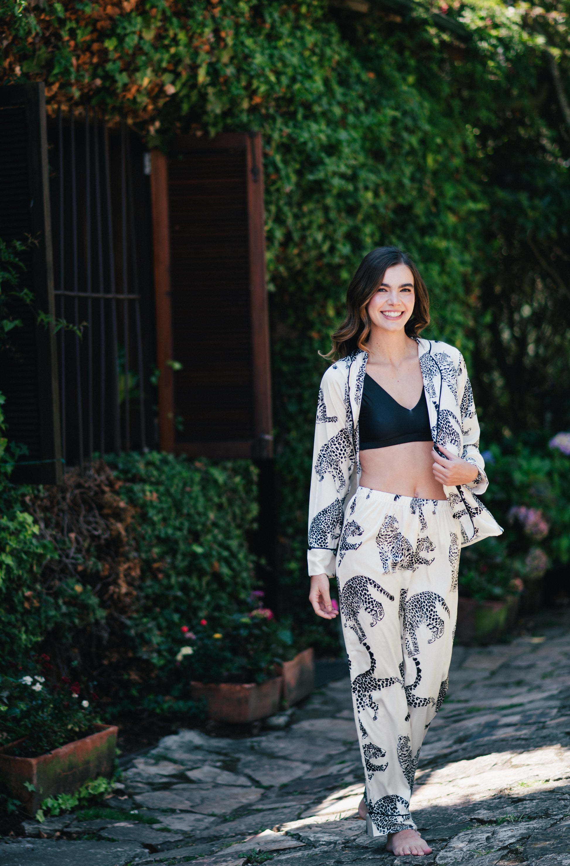 Nuestra pijama Jaguar Negro captura la esencia del poder felino con un diseño monocromático que combina lo clásico y lo audaz. El estampado de jaguares en contraste blanco y negro aporta un estilo atemporal, ideal para quienes no temen destacar incluso en sus momentos de descanso.