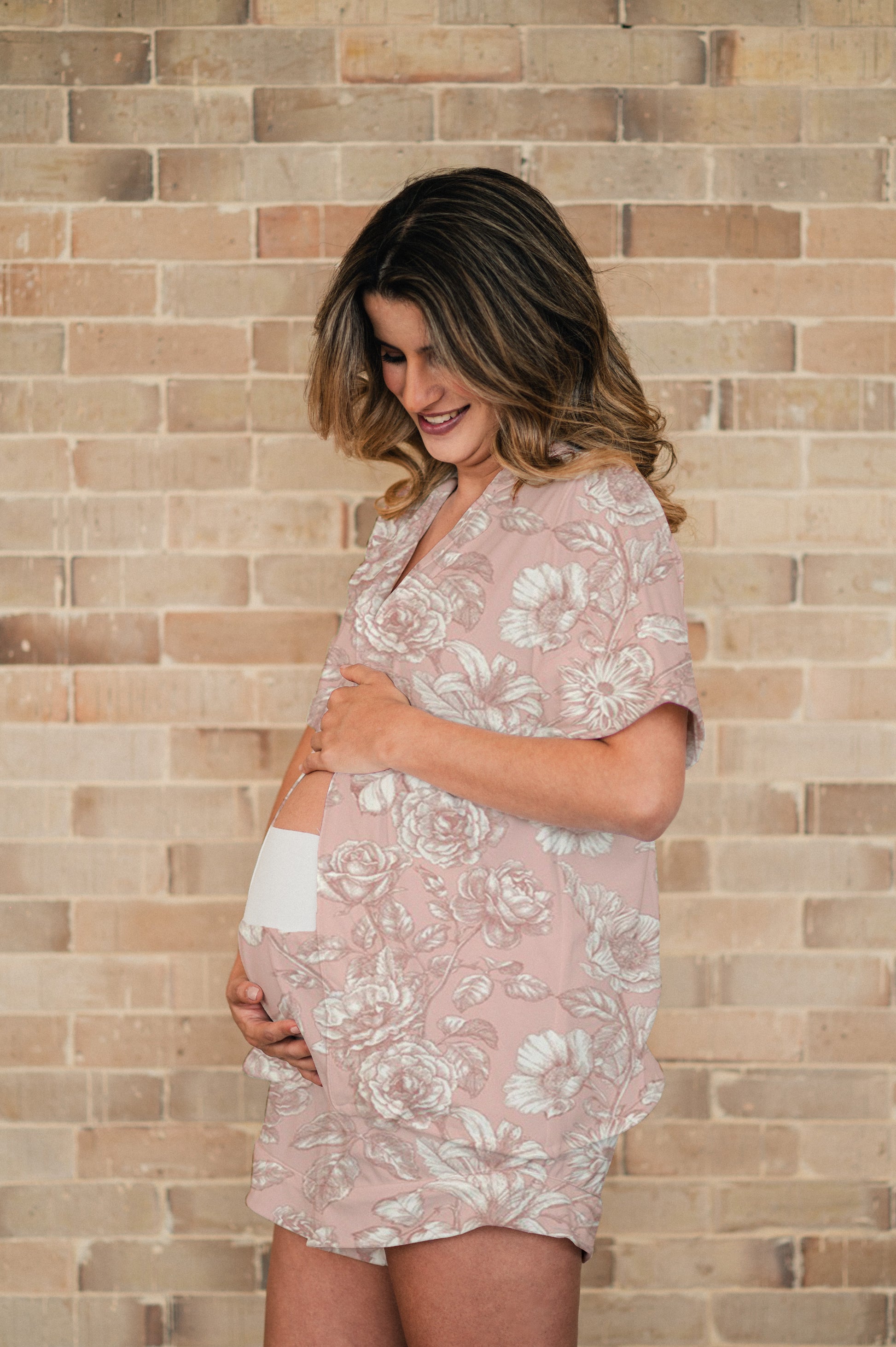 Su delicado estampado floral en tonos palo rosa envuelve tu piel en una sensación de suavidad y romanticismo, perfecta para acompañarte en esta etapa tan especial. Es una pijama cómoda, elegante y femenina que resalta tu belleza natural.