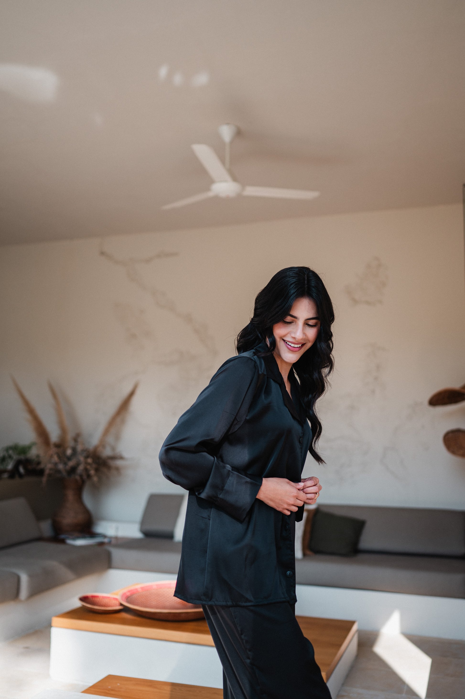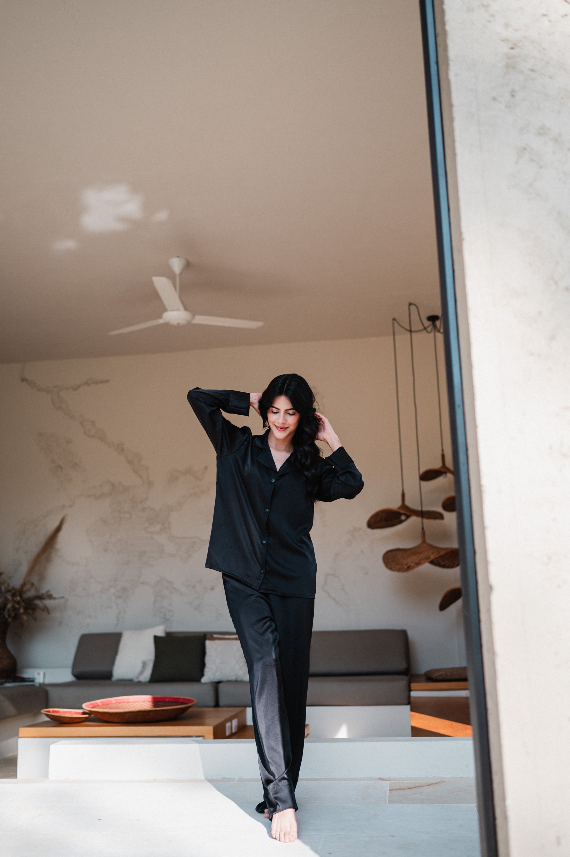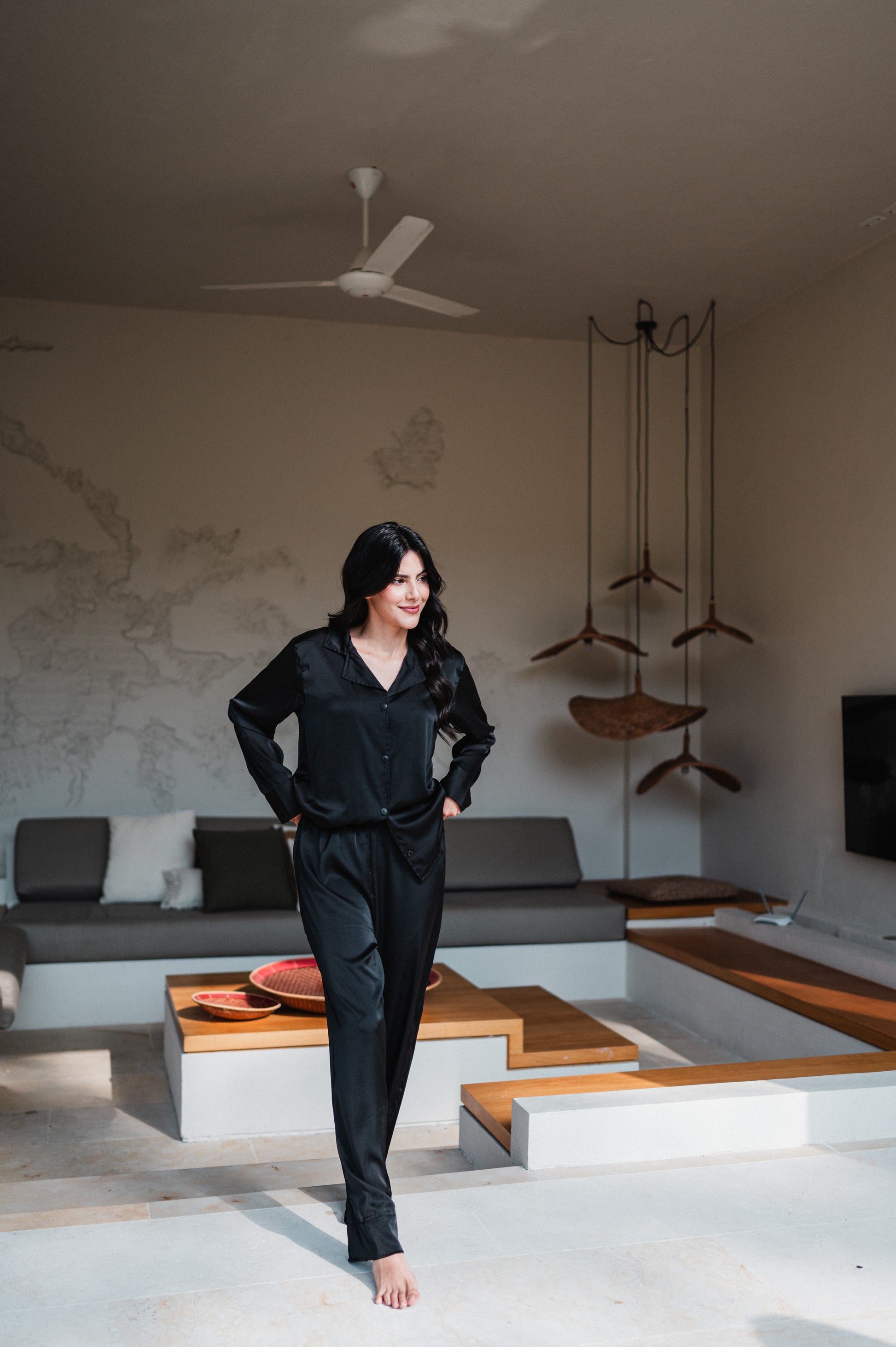 Delicada, elegante y absolutamente encantadora. Nuestra pijama de camisa y pantalón en tono Negro es la definición perfecta de comodidad sofisticada. Diseñada para quienes buscan descansar con estilo, esta pieza combina líneas limpias y detalles sutiles que elevan la experiencia del descanso.
