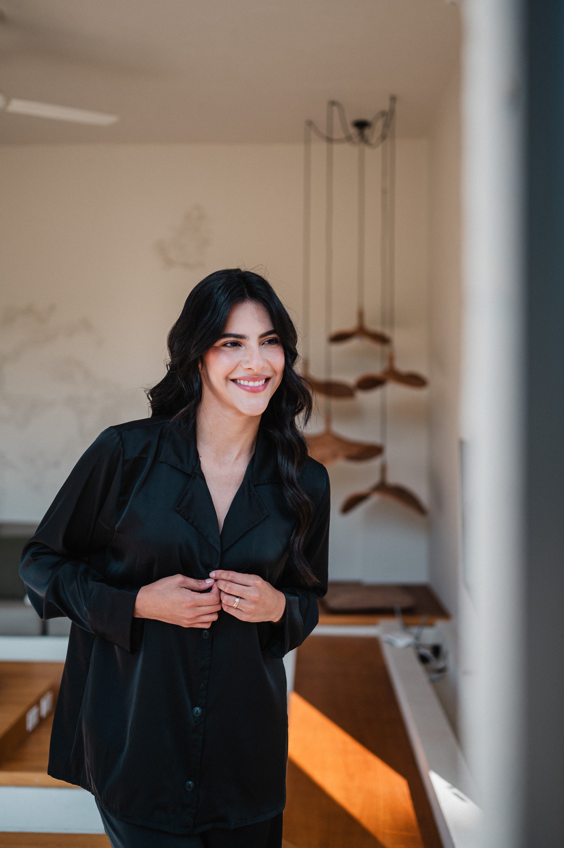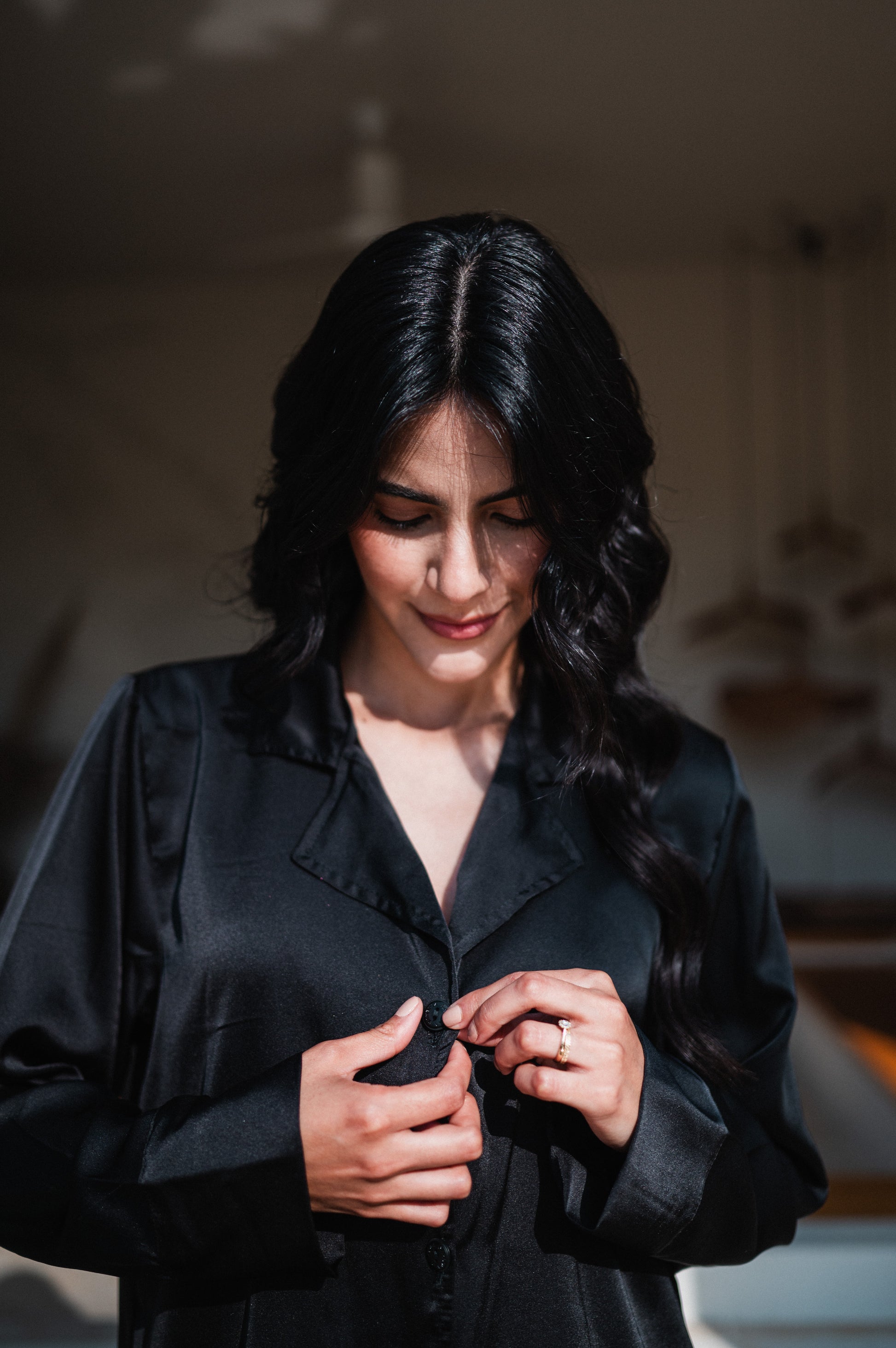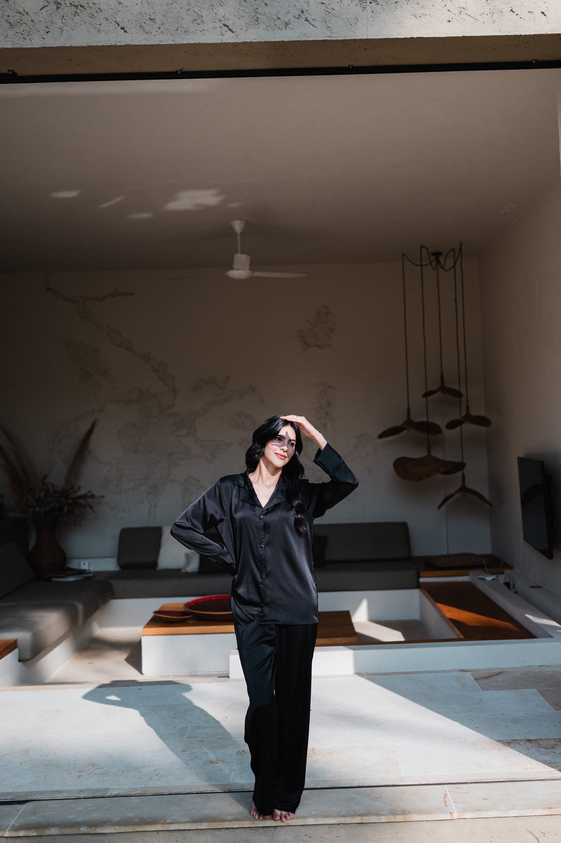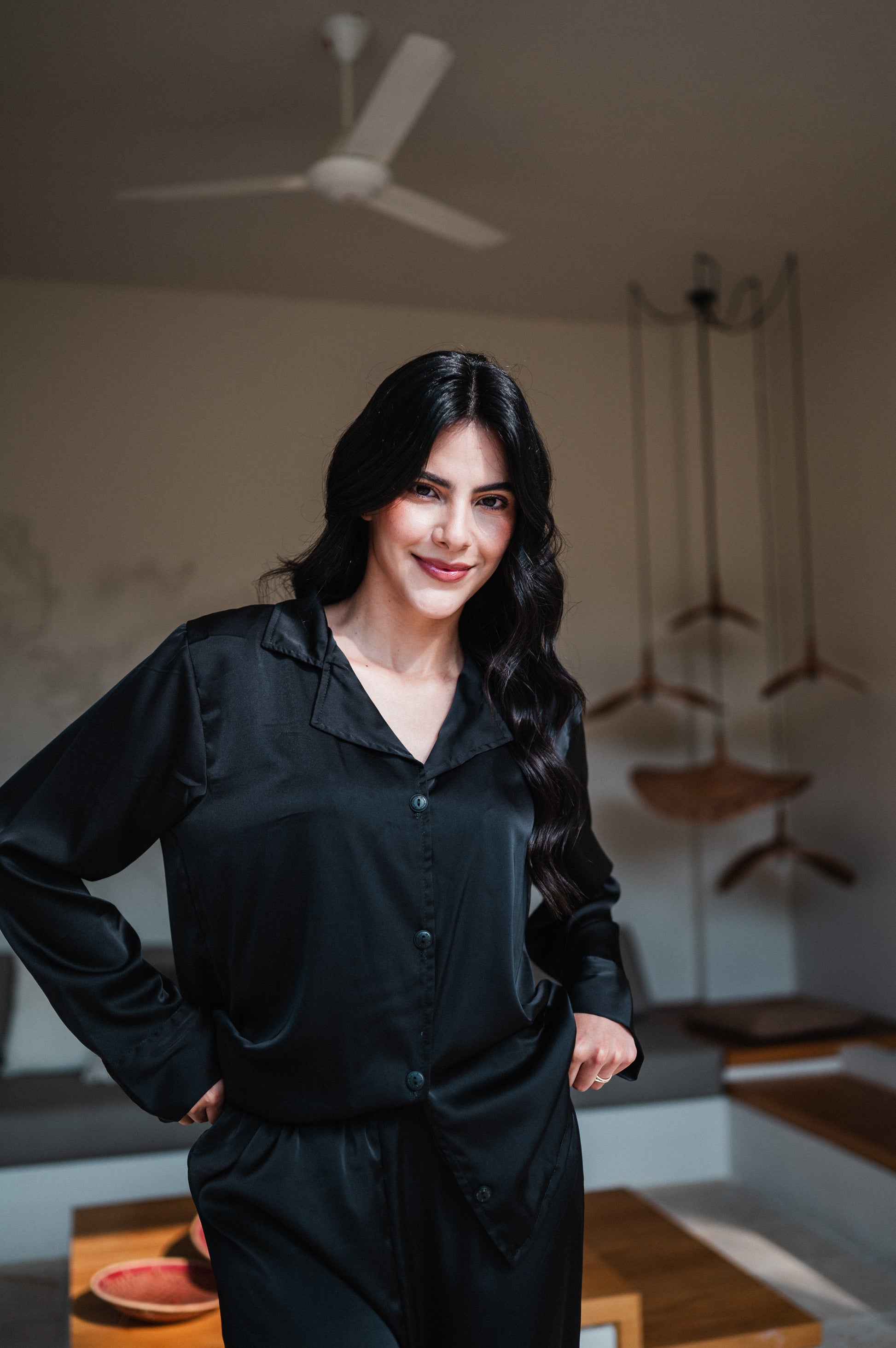 Delicada, elegante y absolutamente encantadora. Nuestra pijama de camisa y pantalón en tono Negro es la definición perfecta de comodidad sofisticada. Diseñada para quienes buscan descansar con estilo, esta pieza combina líneas limpias y detalles sutiles que elevan la experiencia del descanso.
