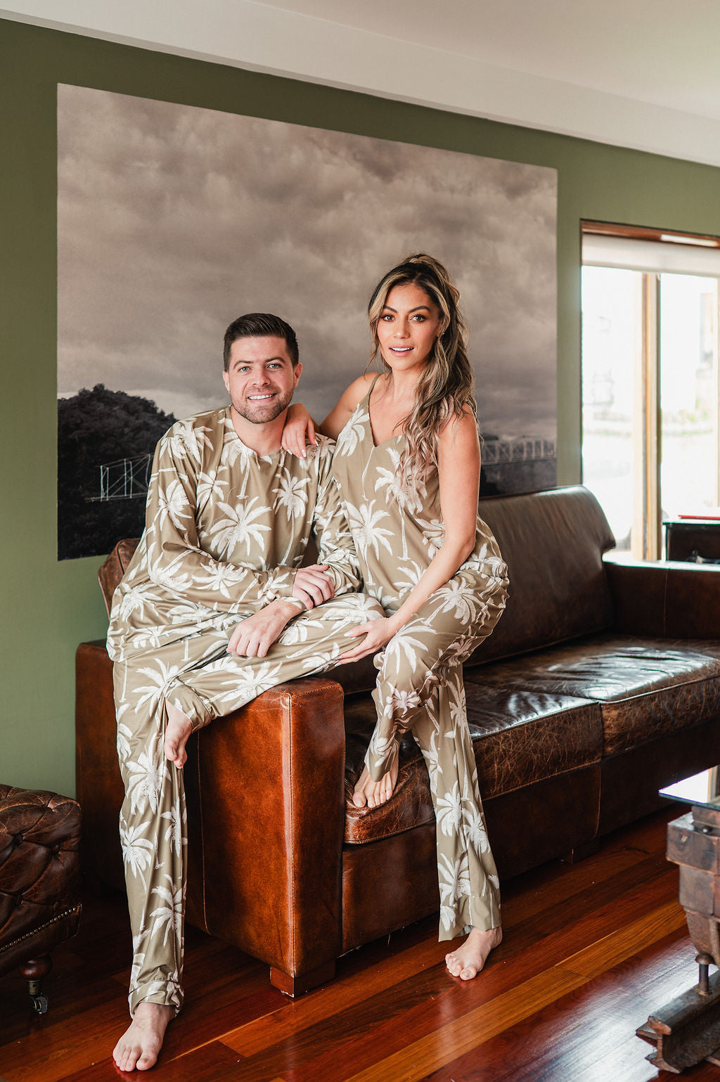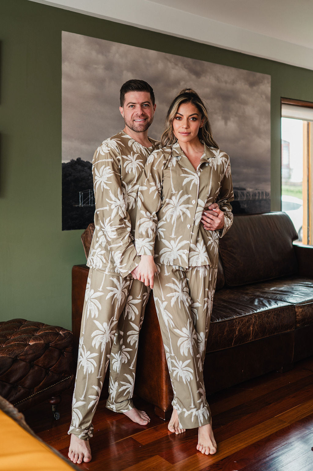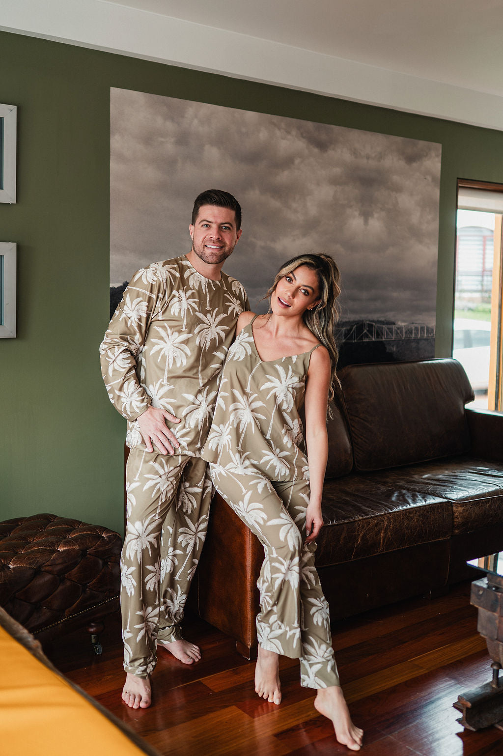 El conjunto Palma Tropical Oliva para hombre incluye camiseta de cuello redondo y pantalón, diseñado para crear matching pijamas de pareja. Perfecto para compartir momentos de confort y estilo con tu pareja, este conjunto ofrece una combinación ideal de suavidad y diseño moderno, haciendo que las noches juntos sean más especiales y memorables.