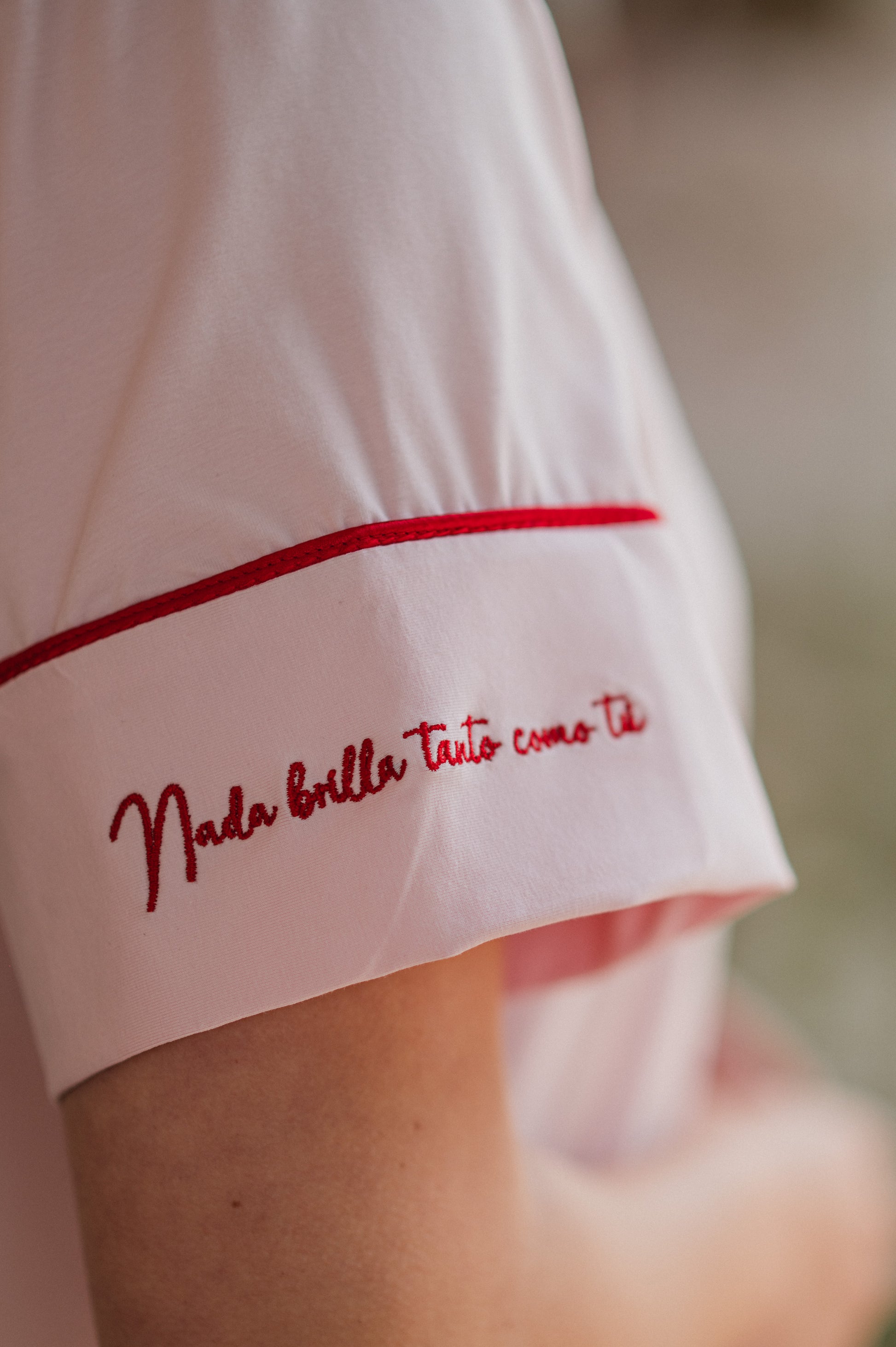 Dulce, femenina y con un toque vibrante, esta pijama de camisa manga corta y short en color rosa con vivos y bordados rojos está diseñada para elevar tus momentos de descanso con estilo y suavidad. Confeccionada en nuestra tela Cairo, un algodón de alta calidad (95% algodón, 5% spandex), esta prenda ofrece una textura fresca, suave y elástica que se adapta perfectamente a tu cuerpo sin perder su forma ni color con el uso.