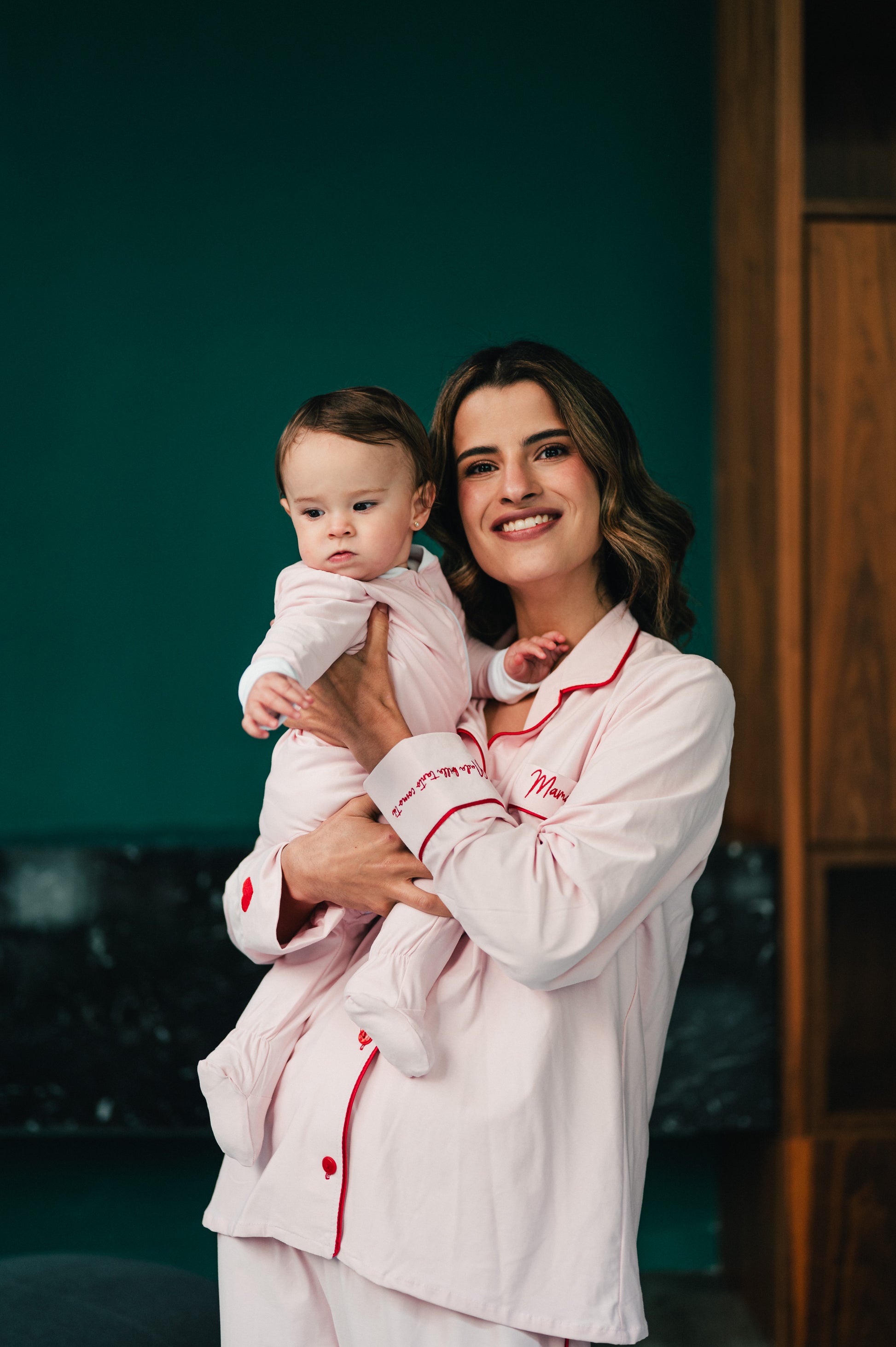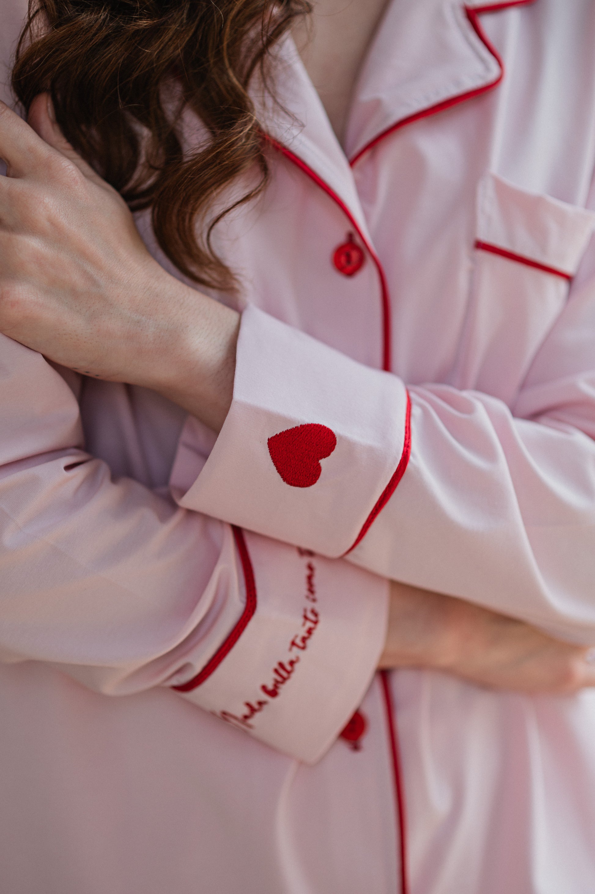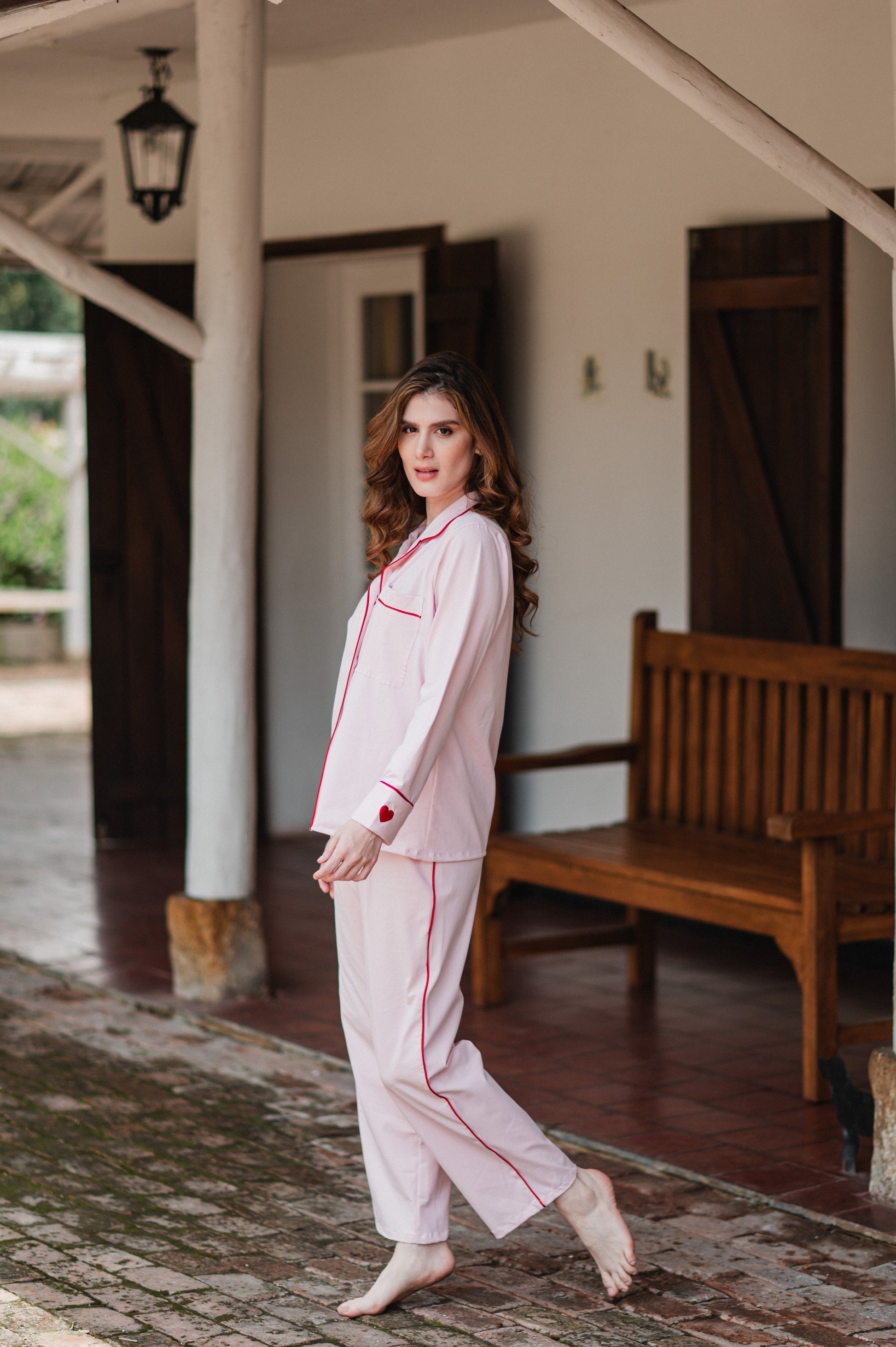Dale un toque de dulzura y sofisticación a tus noches con nuestra pijama de camisa y pantalón en Cairo color rosado con vibrantes detalles rojos. Confeccionada en tela Cairo, compuesta por un 95% de algodón, esta pijama es increíblemente suave, fresca y delicada con tu piel, perfecta para dormir profundamente o disfrutar de un día de descanso en casa.