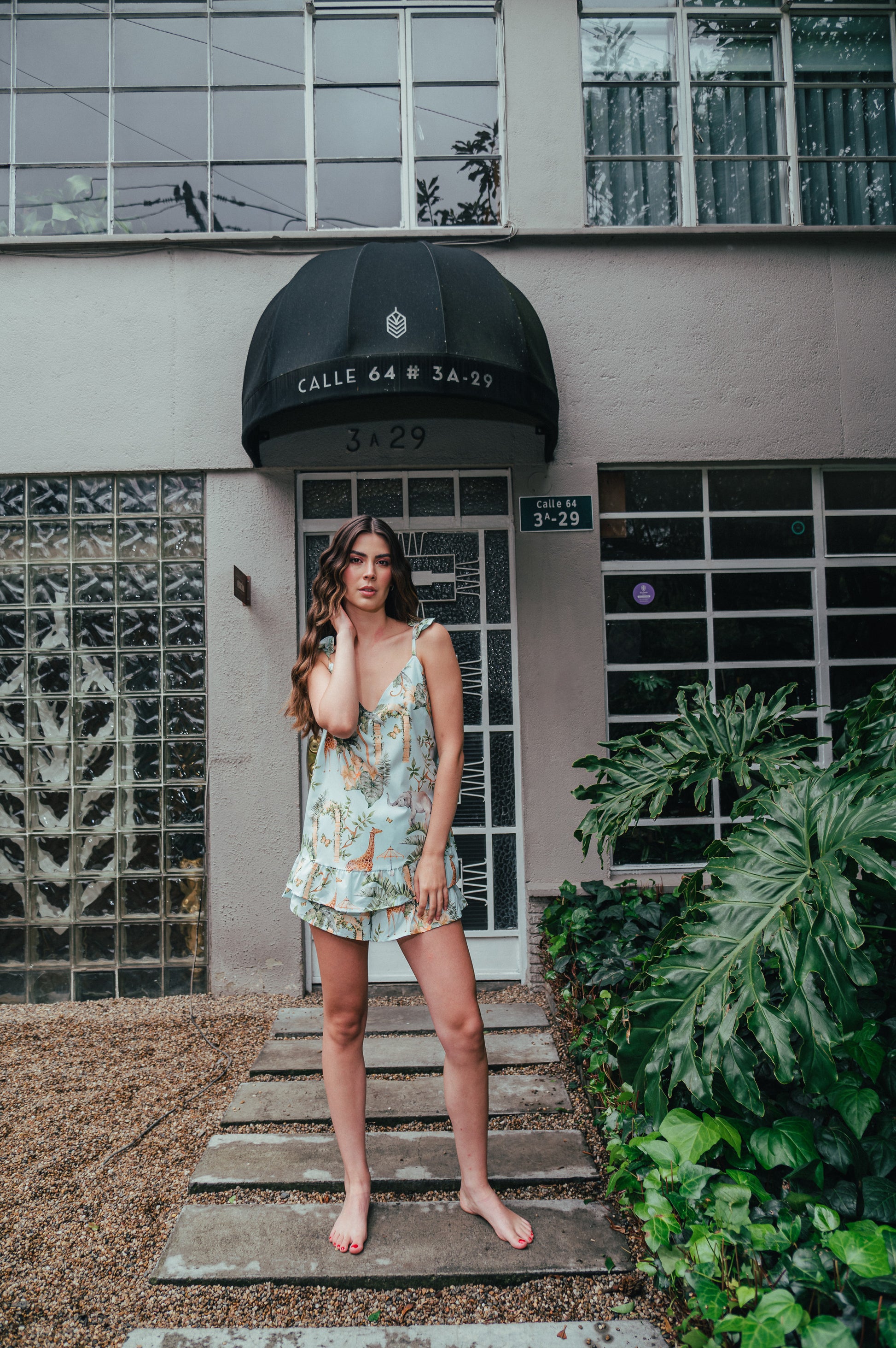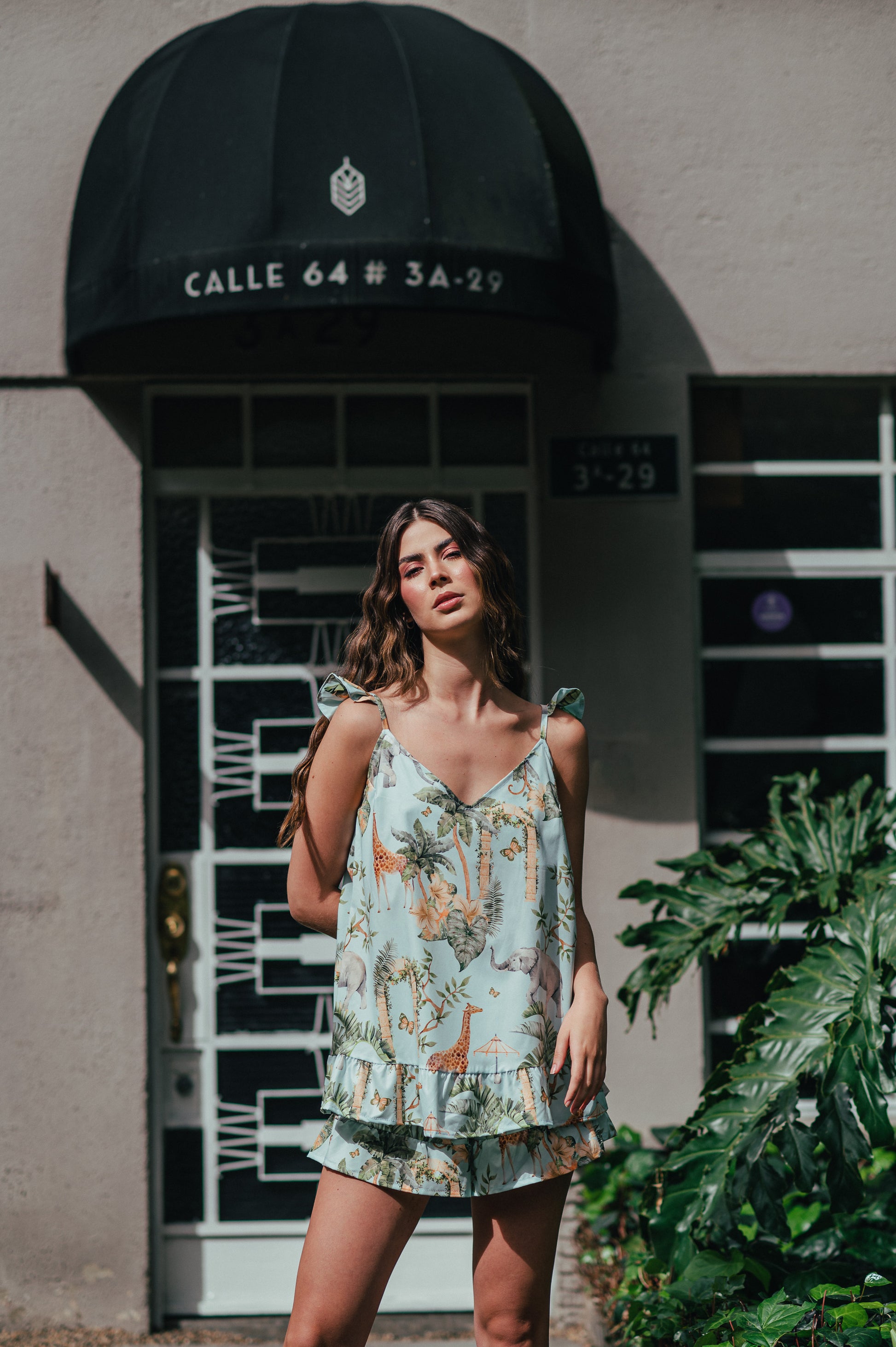 Exótica, suave y mágica. Esta pijama de blusa con arandelas y short en el print Selva Hindú Azul te transporta a un rincón sagrado lleno de calma y belleza natural. Su estampado combina elefantes, flores y símbolos que evocan serenidad y conexión interior, todo sobre un fondo azul profundo que inspira tranquilidad. Los tirantes ajustables y el detalle de arandelas añaden un toque delicado y femenino, mientras el short ligero te brinda máxima comodidad. Ideal para soñar, desconectar y reconectar contigo misma. ✨🦋