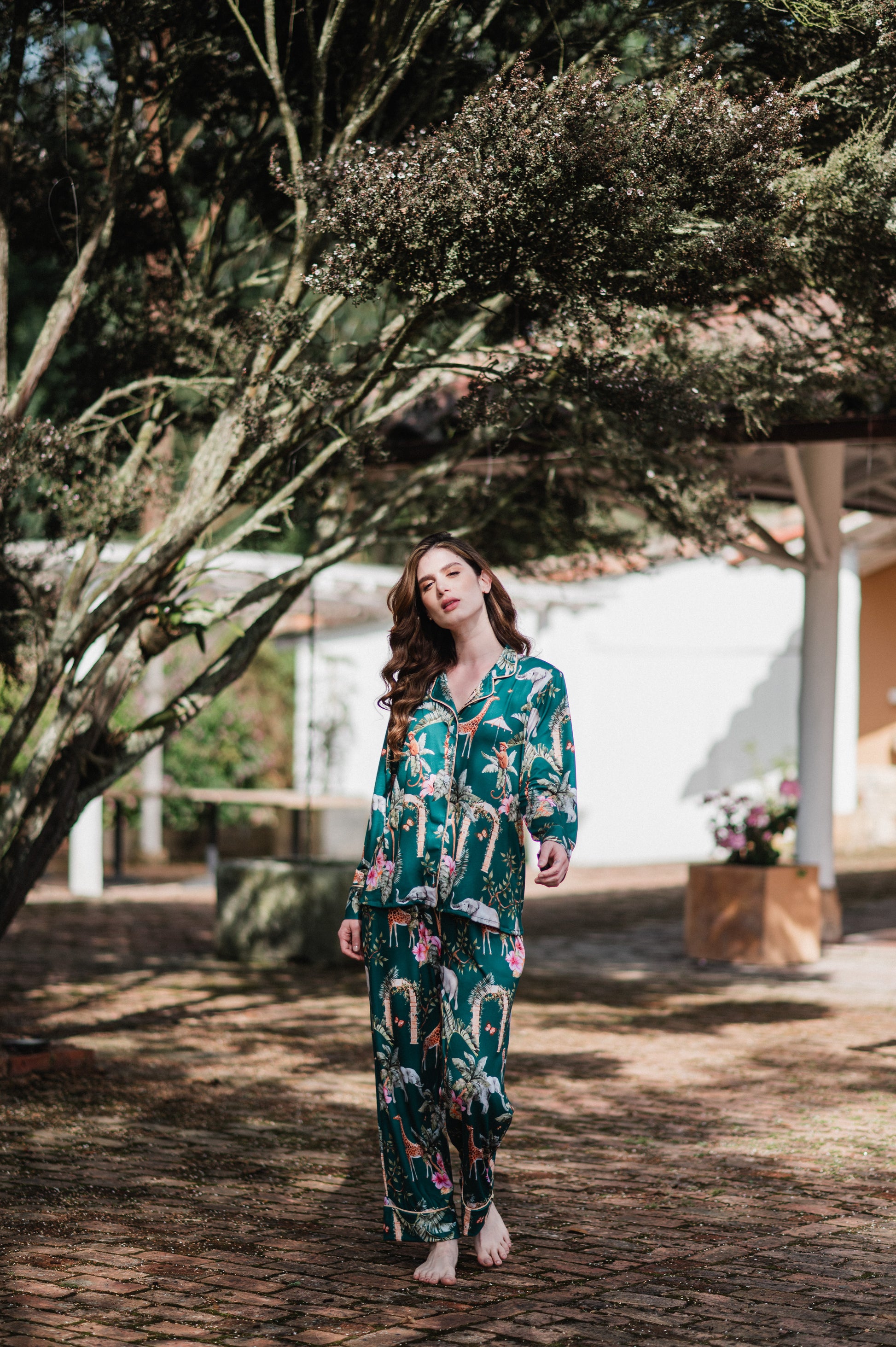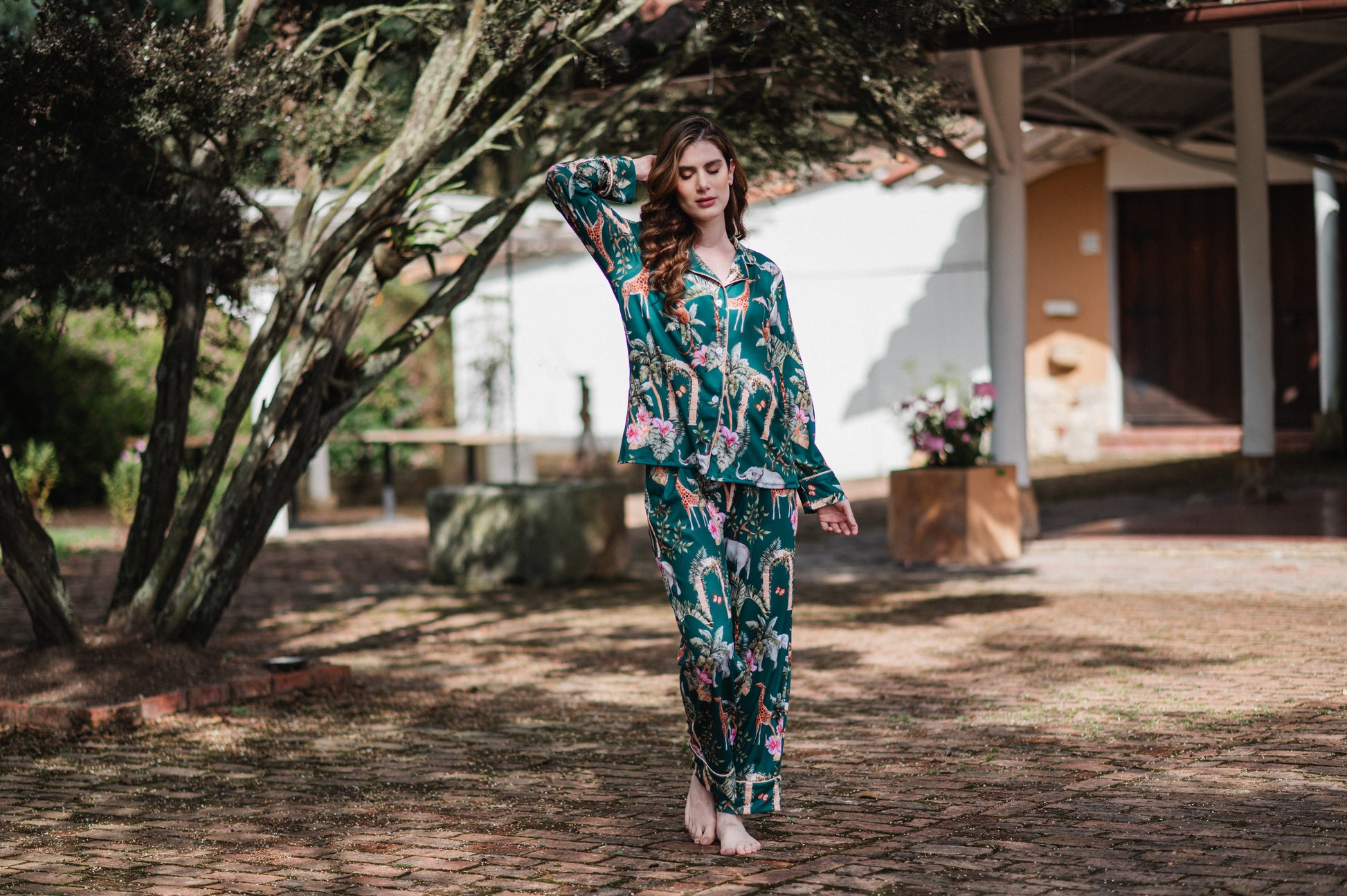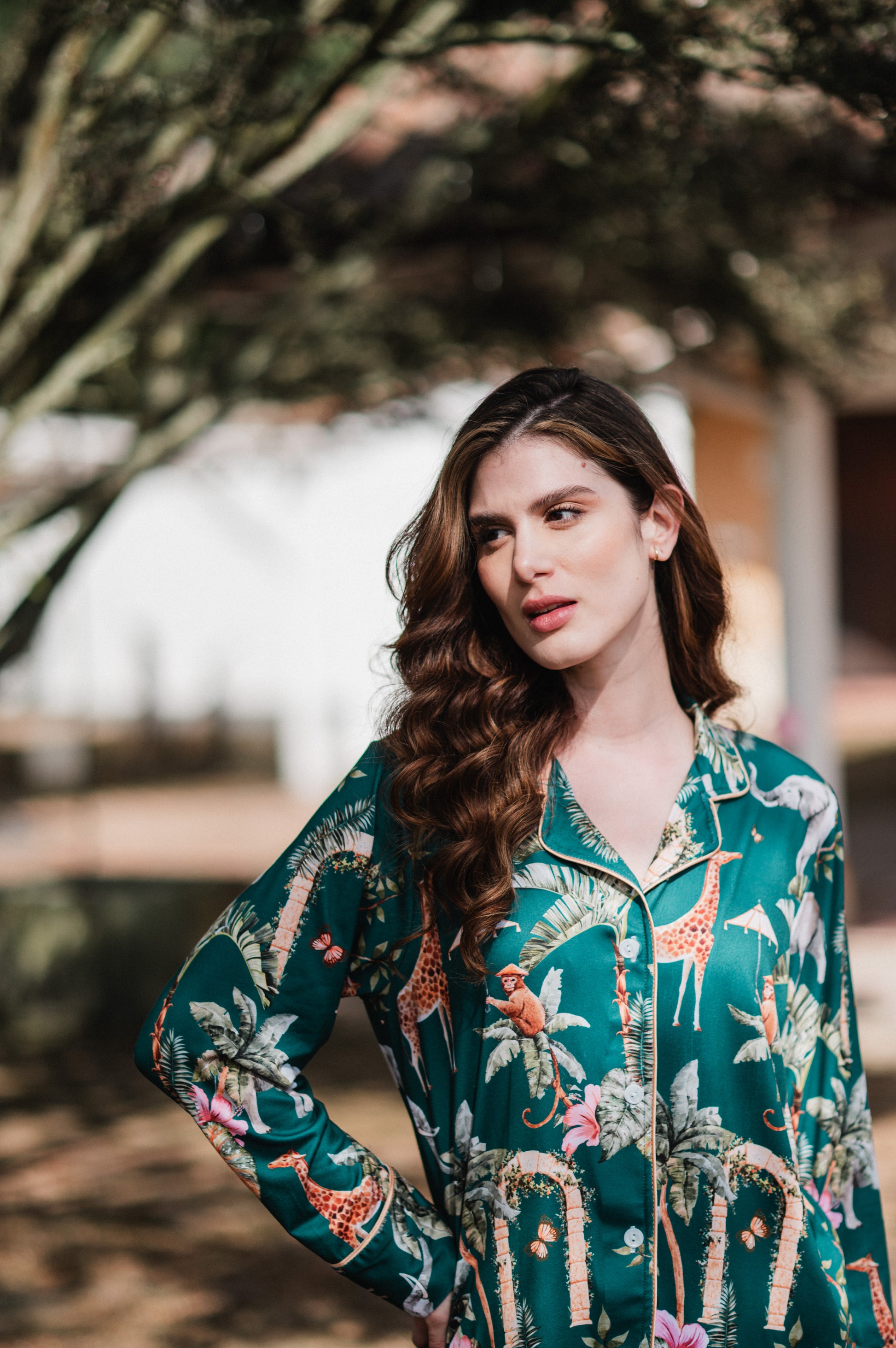Una pijama que despierta tus sentidos y te transporta a un paraíso exótico. El estampado Selva Hindú Jade combina la majestuosidad de la fauna salvaje con la elegancia de la flora tropical sobre un fondo jade profundo que realza cada detalle. Elefantes, jirafas y palmeras se encuentran en armonía para envolver tus noches con magia y estilo.