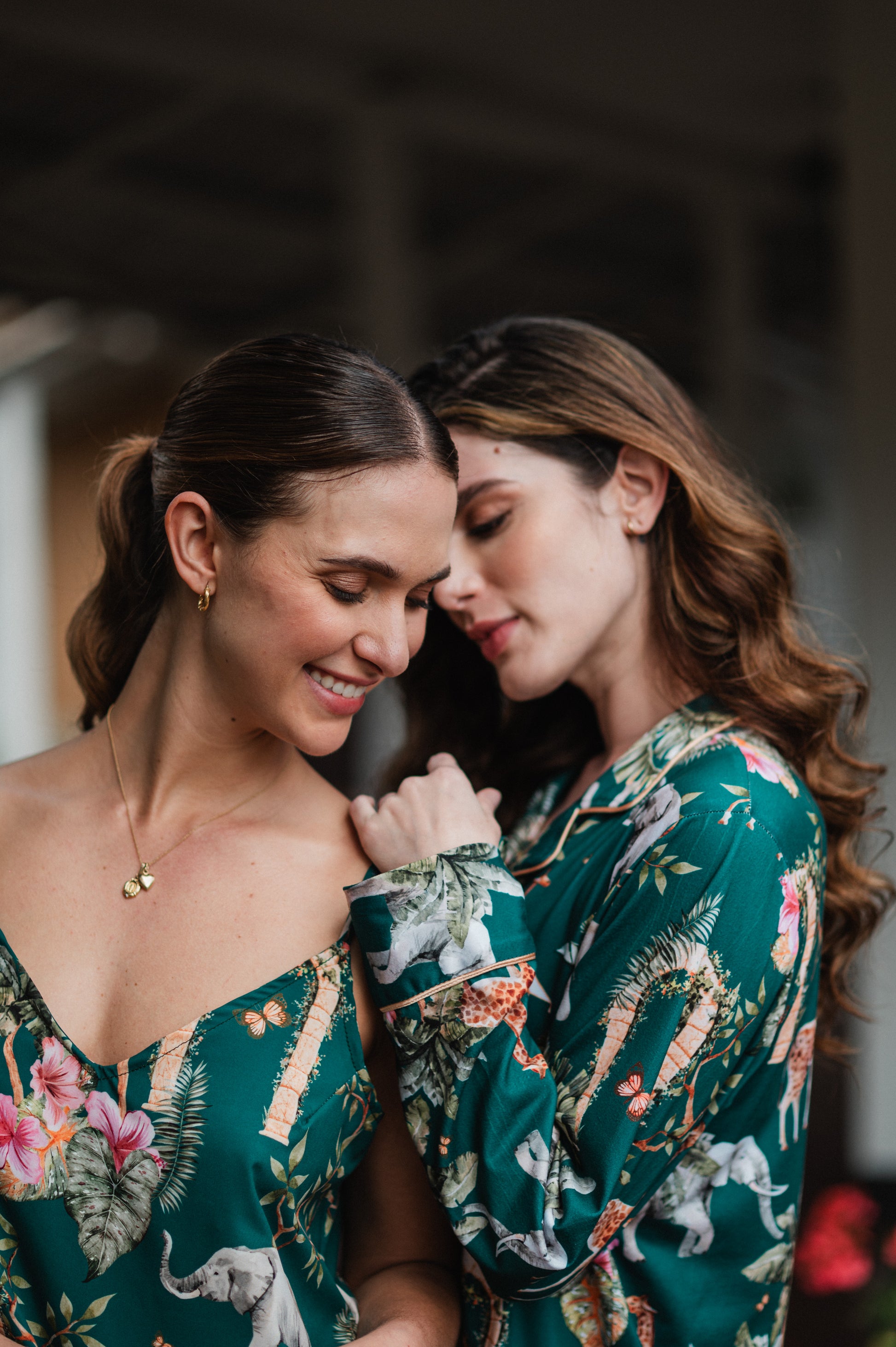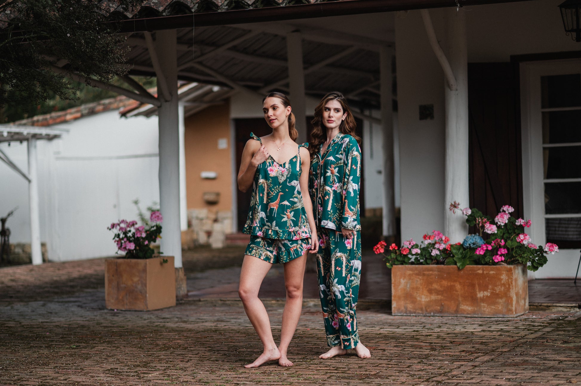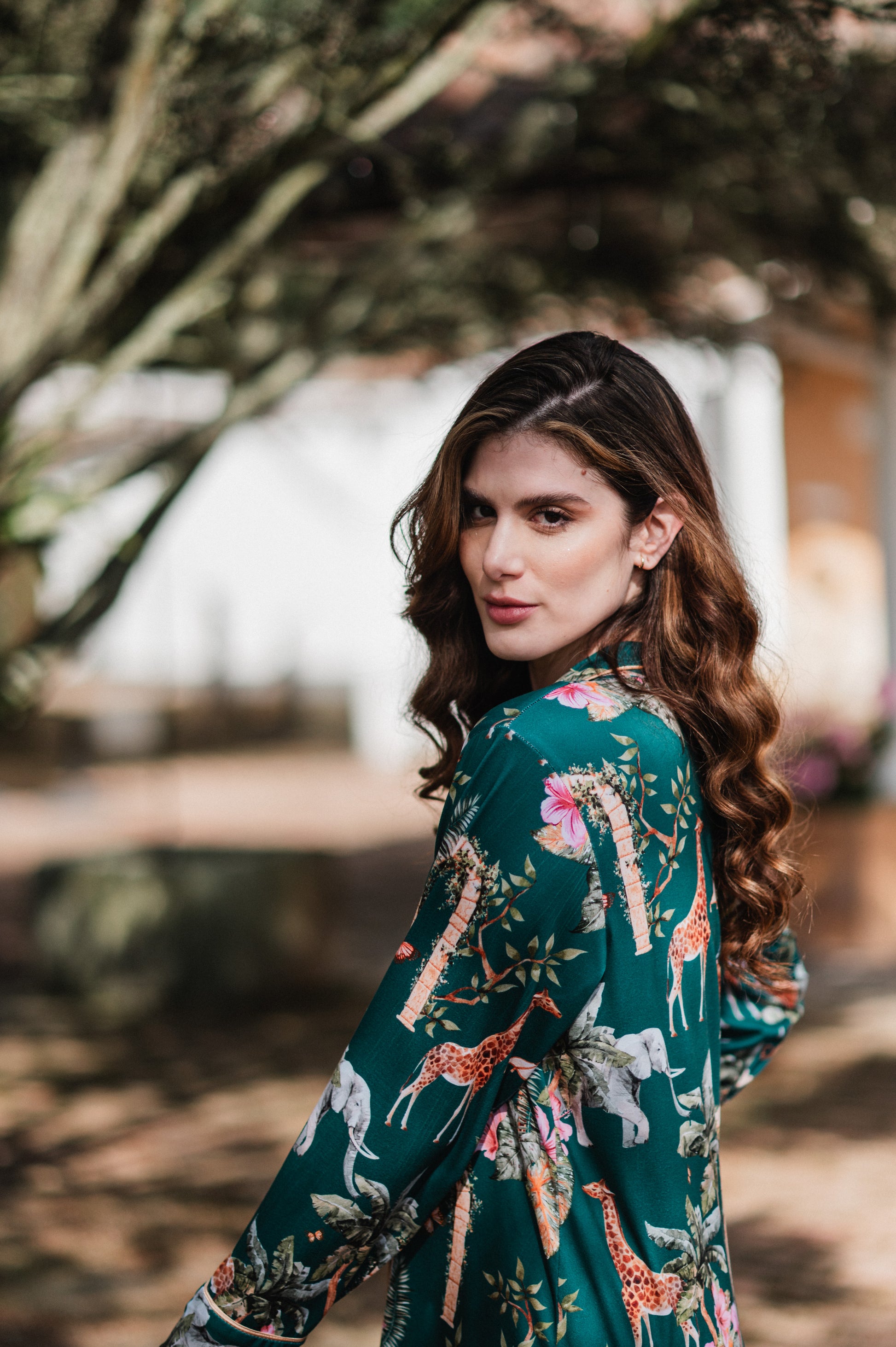 Una pijama que despierta tus sentidos y te transporta a un paraíso exótico. El estampado Selva Hindú Jade combina la majestuosidad de la fauna salvaje con la elegancia de la flora tropical sobre un fondo jade profundo que realza cada detalle. Elefantes, jirafas y palmeras se encuentran en armonía para envolver tus noches con magia y estilo.