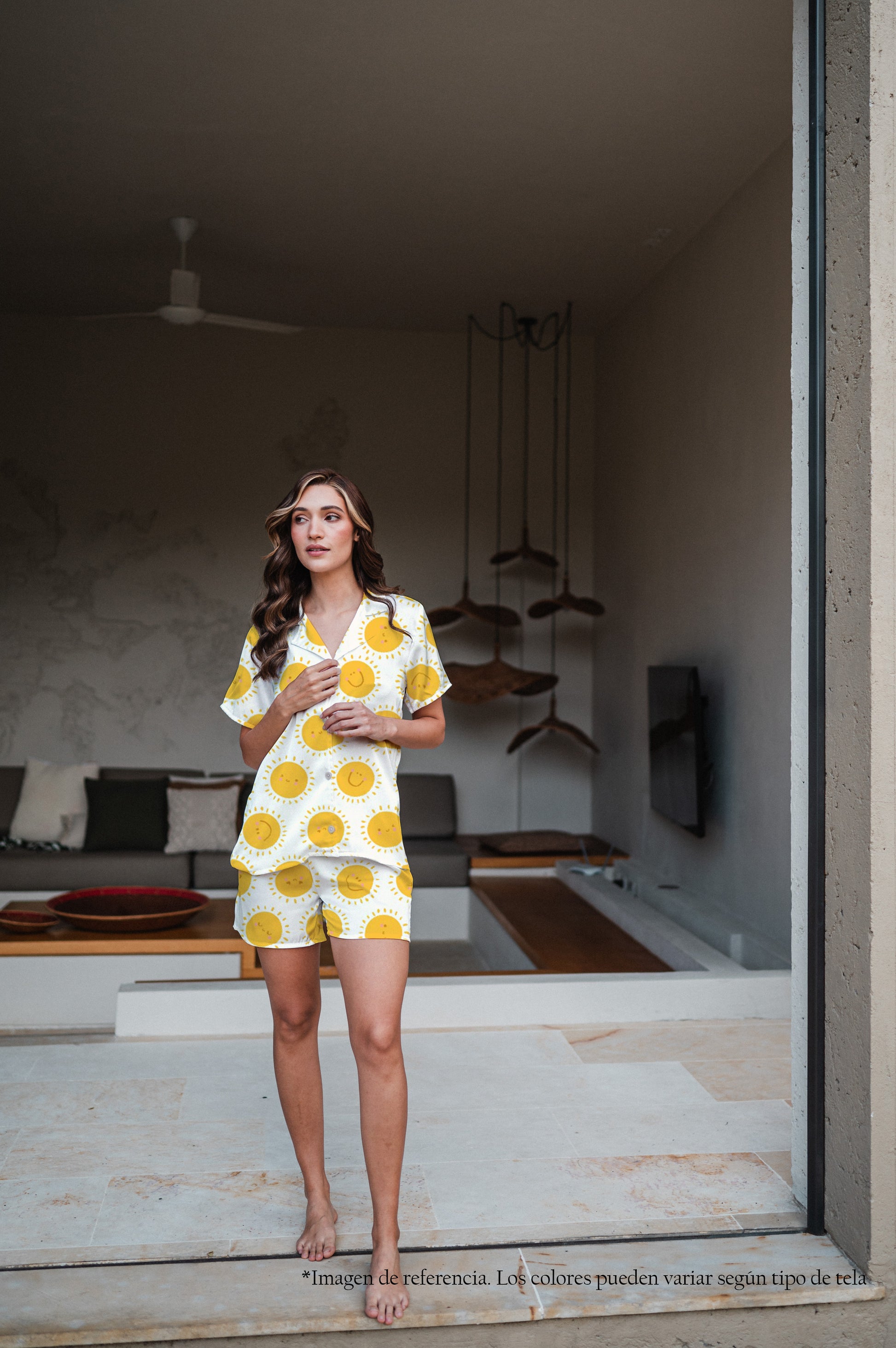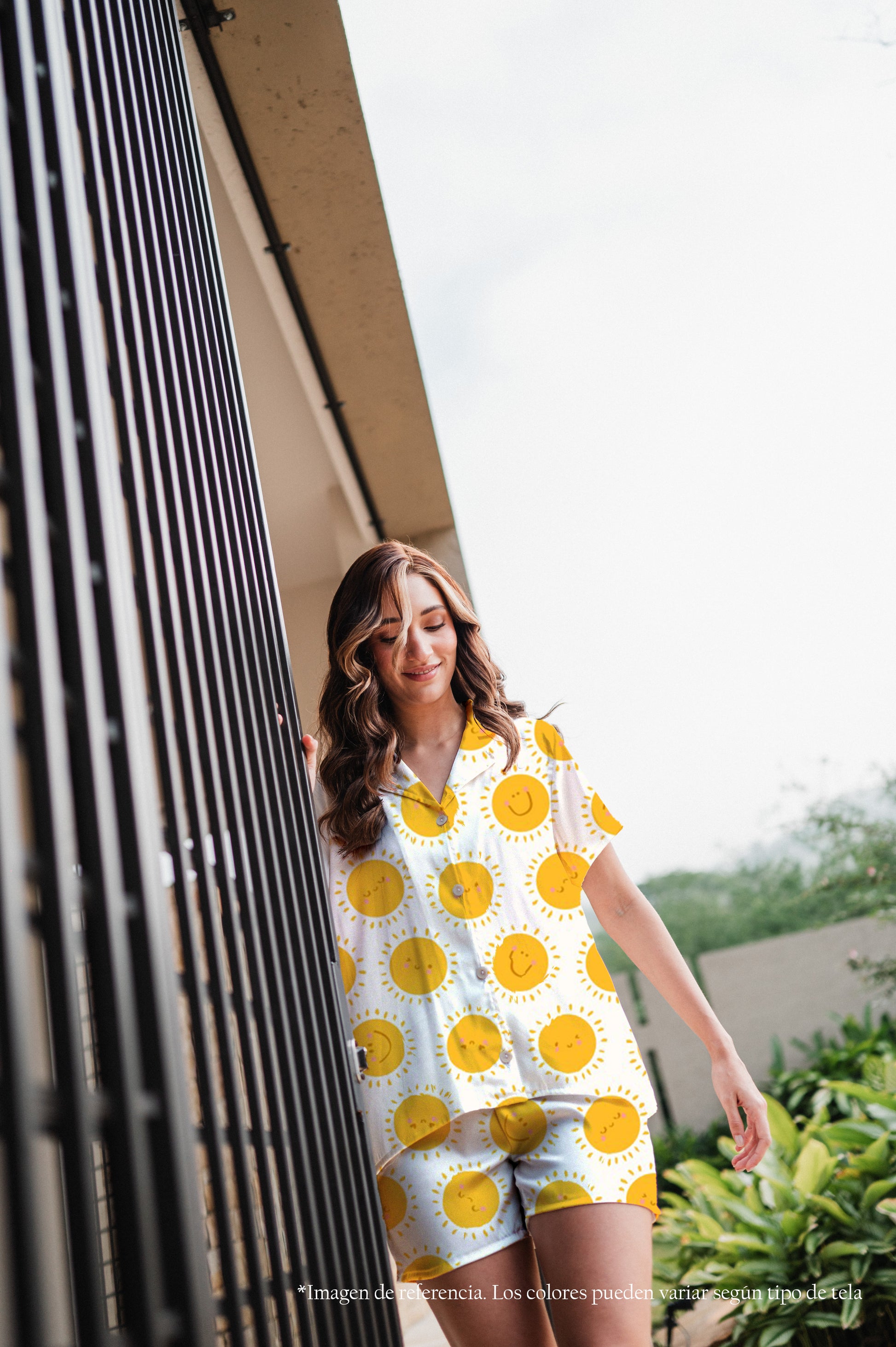 Llena tus días y noches de energía positiva con esta alegre pijama de camisa manga corta y short en el encantador print Solecitos. Su diseño combina pequeños soles sonrientes sobre un fondo suave, evocando calidez, buen humor y una vibra luminosa que te acompaña desde el primer momento del día.