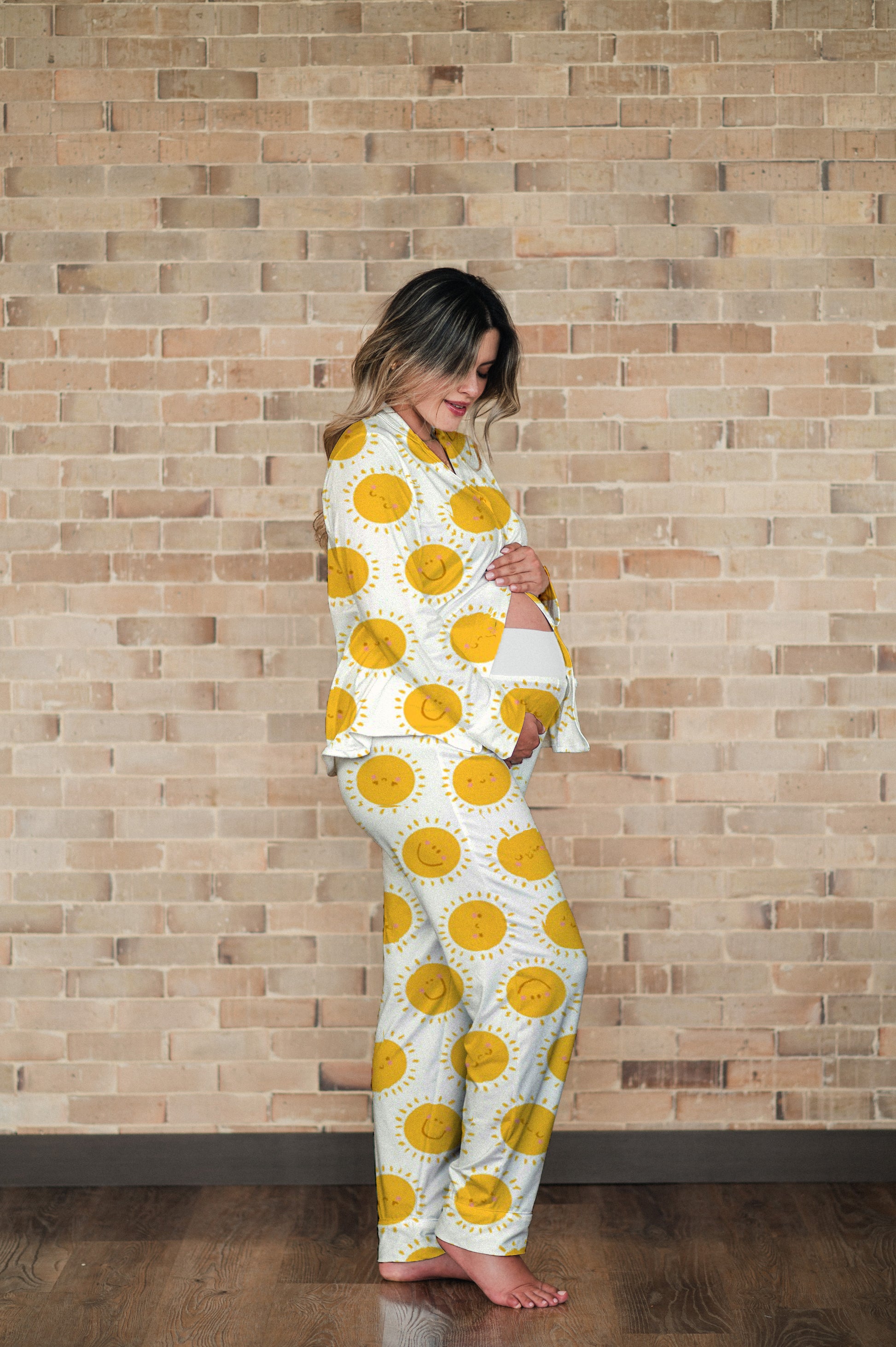 Radiante, alegre y llena de energía positiva, nuestra pijama de maternidad camisa y pantalón en el print Solecitos es ideal para acompañarte con luz y calidez durante tu embarazo. Su estampado de pequeños soles sonrientes transmite optimismo y ternura, iluminando cada momento de descanso con un toque encantador.