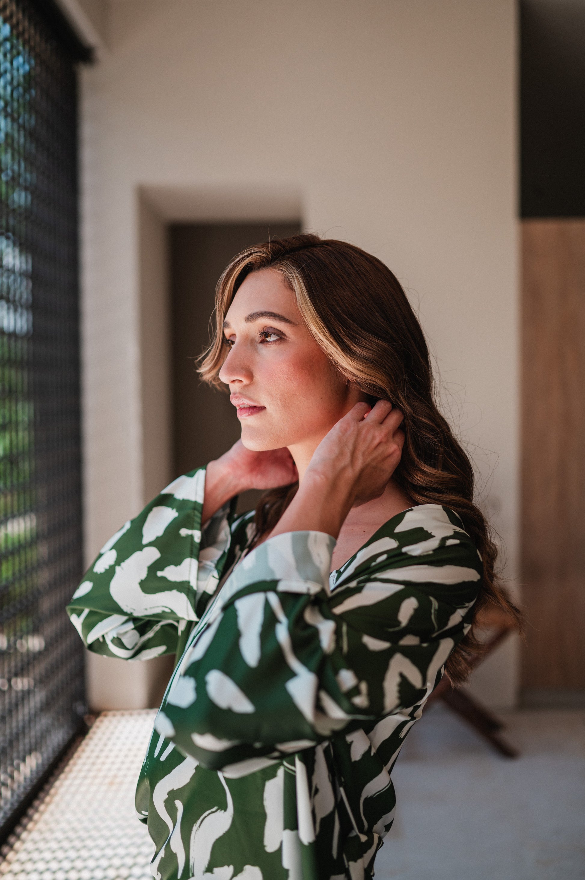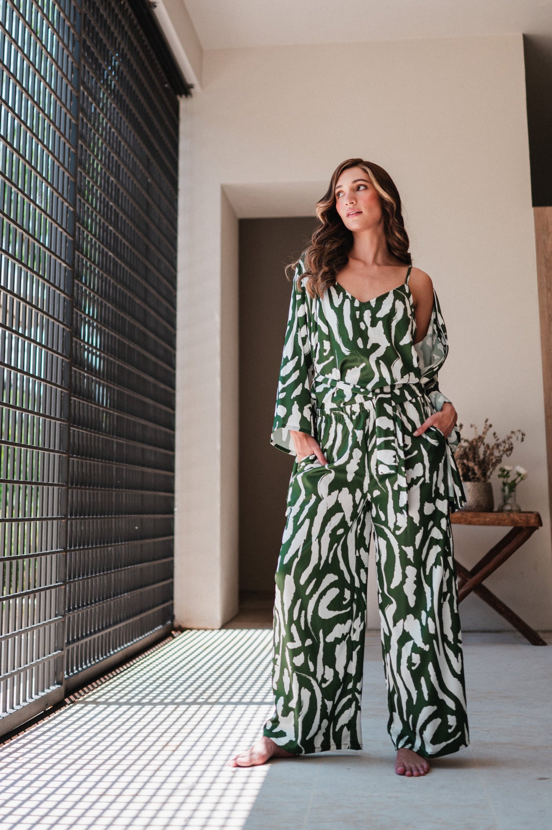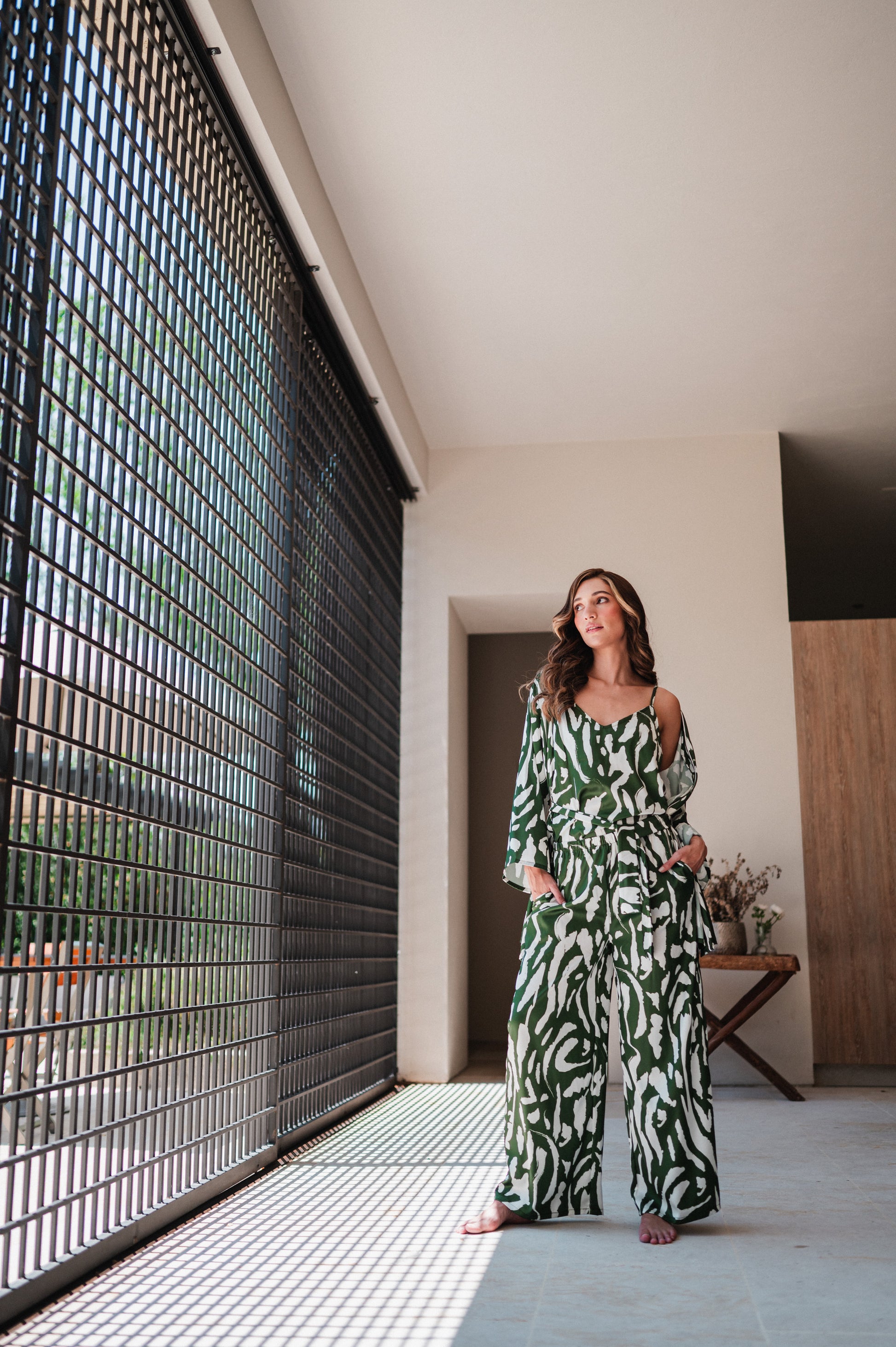 Inspirada en el arte de lo simple y lo natural, esta pijama de tres piezas en el print Trazos en Verde combina diseño moderno y confort absoluto. La levantadora fluida, la blusa de tiras fresca y el pantalón de silueta relajada crean un conjunto versátil y estilizado, ideal para acompañarte desde el descanso hasta los momentos más tranquilos del día. Su estampado de líneas orgánicas en tonos verdes transmite equilibrio y serenidad, perfecto para mujeres que buscan una estética sutil pero con personalidad. Una pijama pensada para sentirte bien, verte bien y disfrutar cada instante en casa con estilo.